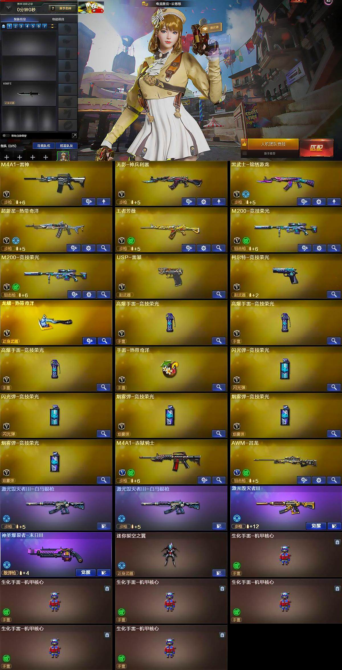 【英雄级武器】:M4A1-雷神,无影-神兵利器,黑武士-锦绣游龙,超新星-热带奇洋,王者芳薇-觉醒版,M200-竞技荣光*2,USP-雷暴,柯尔特-竞技荣光,龙啸-热带奇洋,高爆手雷-竞技荣光*3,手雷-热带奇洋,闪光弹-竞技荣光*2,烟雾弹-竞技荣光*3,M4A1-赤狱骑士,AWM-昌龙