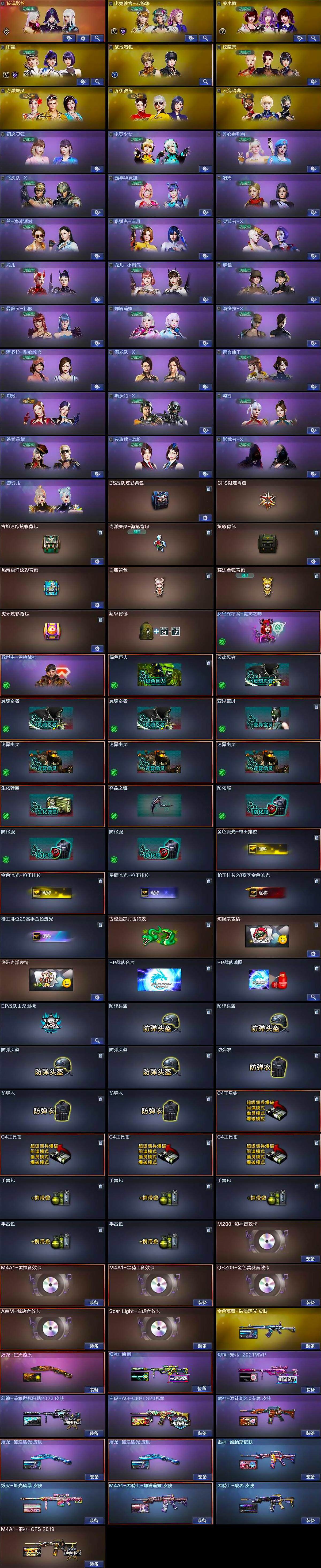 【皮肤】:幻神-青鹤,幻神-宠儿-2021MVP,幻神-荣耀世冠白鲨2023 皮肤,白虎-AG-CFPLS20冠军,金色蔷薇-破浪逐光 皮肤,M4A1-雷神-CFS 2019,雷神-维纳斯皮肤,雷神-源计划2.0专属 皮肤,毁灭-虹光风暴 皮肤,M4A1-黑骑士-娜塔莉娅 皮肤,黑骑士-破界 皮肤,屠龙-星火燎原,屠龙-破浪逐光 皮肤*2