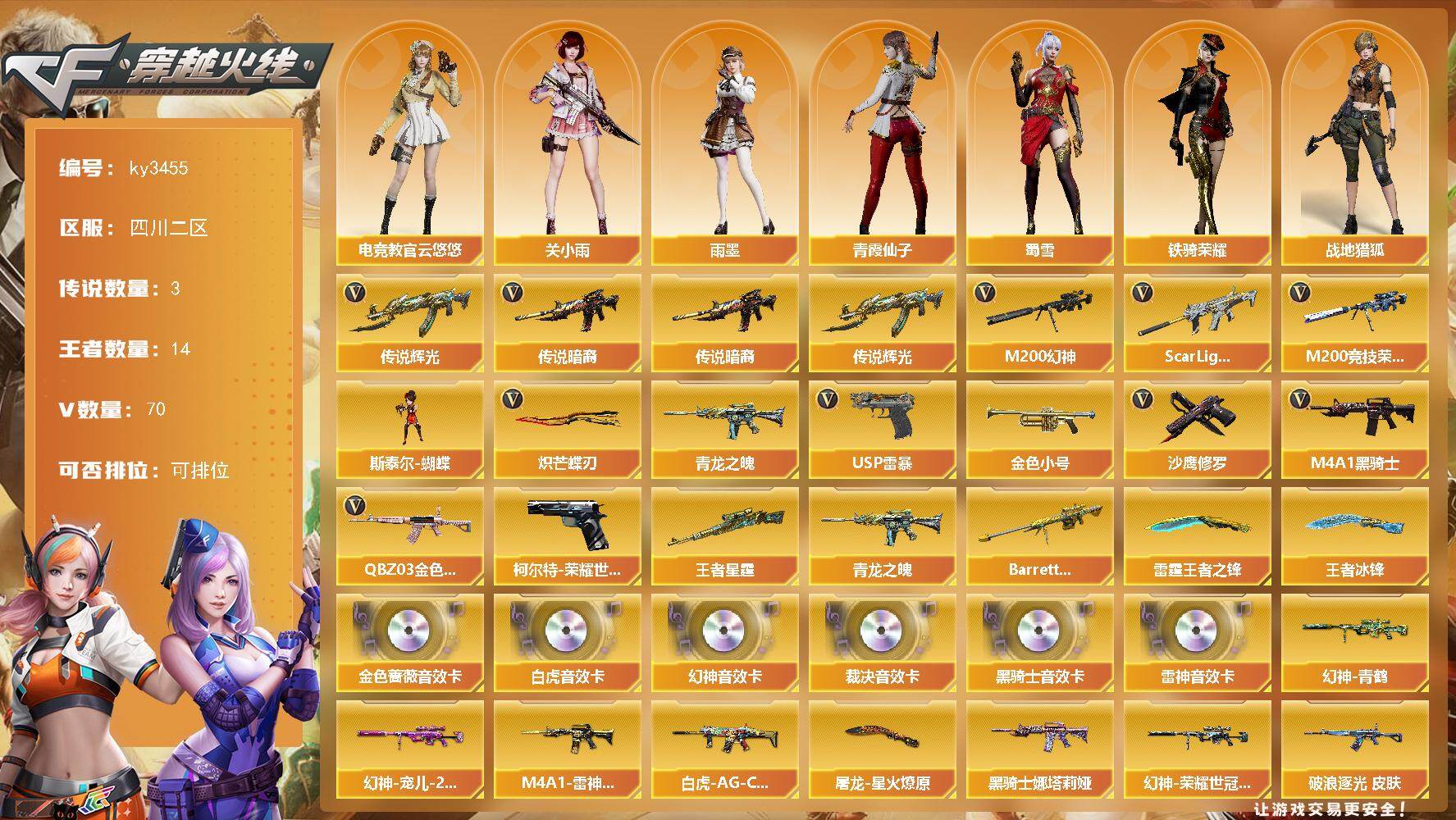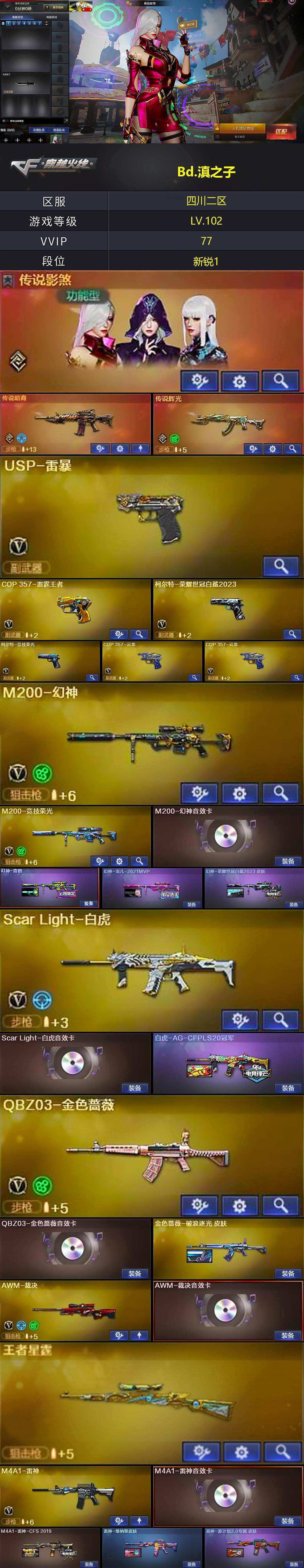 [13657174]四川二区-70V-14王者-0炫金 【传说武器】:传说暗裔,传说辉光 【传说角色】:传说影煞 【热门武器】:传说暗裔,传说辉光,QBZ03-金色蔷薇,Scar Light-白虎,M200-幻神,柯尔特-荣耀世冠白鲨2023,M200-竞技荣光,青龙之魄,金色小号,M4A1-黑骑士,斯泰尔-蝴蝶,USP-雷暴,沙鹰-修罗,炽芒蝶刃 【王者炫金武器】:青龙之魄,Barrett-雷霆王者,王者星霆,雷霆王者之锋,王者冰锋 【音效卡】:M200-幻神音效卡,M4A1-雷神音效卡,M4A1-黑骑士音效卡,QBZ03-金色蔷薇音效卡,AWM-裁决音效卡,Scar Light-白虎音效卡 【皮肤】:幻神-青鹤,幻神-宠儿-2021MVP,幻神-荣耀世冠白鲨2023 皮肤,白虎-AG-CFPLS20冠军,金色蔷薇-破浪逐光 皮肤,M4A1-雷神-CFS 2019,雷神-维纳斯皮肤,雷神-源计划2.0专属 皮肤,毁灭-虹光风暴 皮肤,M4A1-黑骑士-娜塔莉娅 皮肤,黑骑士-破界 皮肤,屠龙-星火燎原,屠龙-破浪逐光 皮肤*2 【角色】:电竞教官-云悠悠,关小雨,雨墨,战地猎狐,蛇隐宗,奇洋探员,乔伊教练,云海玲珑,初恋灵狐,电竞少女,芳心审判者,飞虎队-X,嘉年华灵狐,娟娟,兰-海滩派对,兰-新年限定,猎狐者-追月,0号玩家,灵狐者-X,龙儿,龙儿-小淘气,麻雀,曼陀罗-礼服,娜塔莉娅,潘多拉-X,潘多拉-甜心教官,潜龙队-X,青霞仙子,蛇姬,斯沃特-X,蜀雪,铁骑荣耀,兔囡囡,夜玫瑰-宠粉,影武者-X,游珑儿 【人偶武器】:斯泰尔-蝴蝶,迷你裂空之翼,迷你牛魔王,迷你曼提柯尔,迷你牛牛,迷你火种,迷你生化手雷,生化手雷-机甲核心 【暴走生化】:超级对讲机 【挑战大师】:神圣爆裂者III,试炼破坏者III,神圣爆裂者-末日III 【英雄级武器】:M4A1-雷神,M4A1-黑骑士,M4A1-死神,Scar Light-白虎,QBZ03-天罚,无影-神兵利器,黑武士-锦绣游龙,超新星-热带奇洋,QBZ03-金色蔷薇,王者之心-觉醒版,黑骑士-海王*2,Barrett-毁灭,AWM-裁决,M200-幻神,M200-竞技荣光,VSK-94-金蚀,沙鹰-修罗,沙鹰-天神*3,USP-雷暴,COP 357-雷霆王者-觉醒版,柯尔特-荣耀世冠白鲨2023,柯尔特-竞技荣光,COP 357-云龙