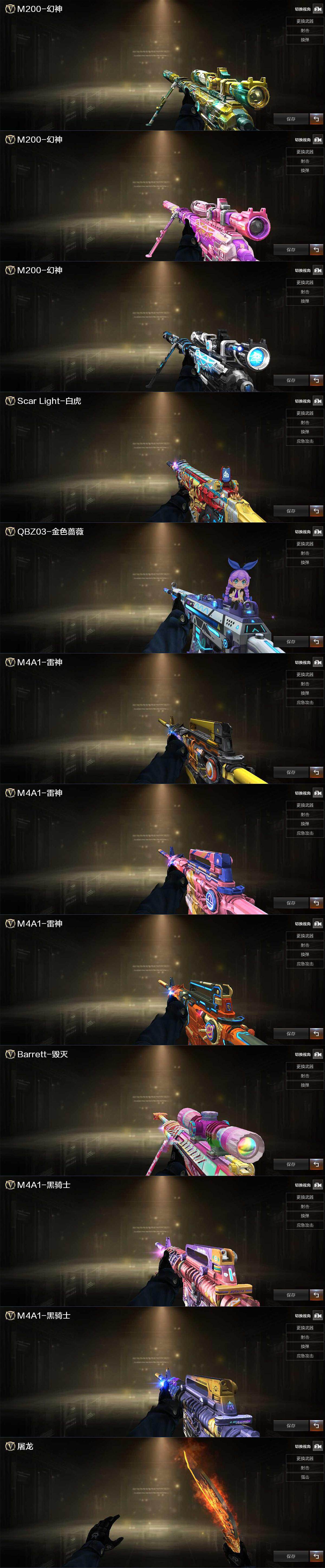 【音效卡】:M200-幻神音效卡,M4A1-雷神音效卡,M4A1-黑骑士音效卡,QBZ03-金色蔷薇音效卡,AWM-裁决音效卡,Scar Light-白虎音效卡