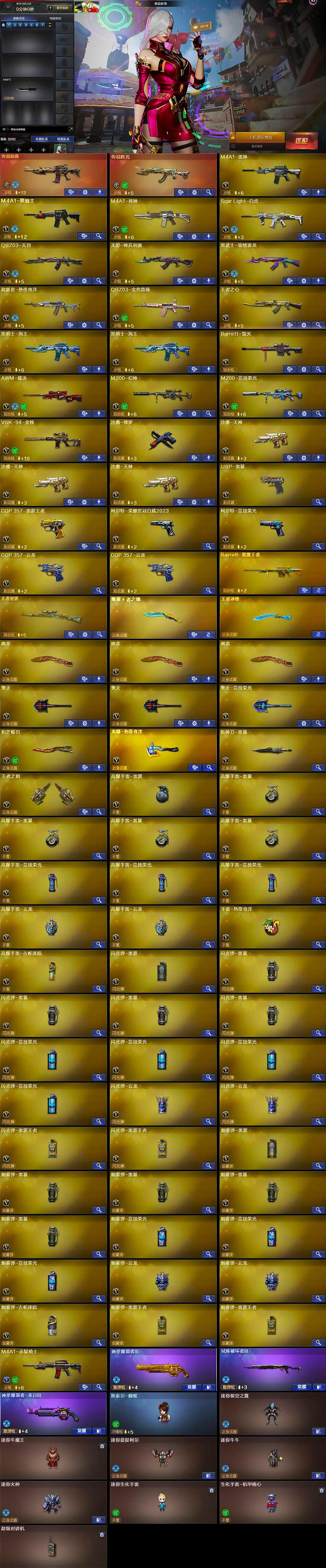 【英雄级武器】:M4A1-雷神,M4A1-黑骑士,M4A1-死神,Scar Light-白虎,QBZ03-天罚,无影-神兵利器,黑武士-锦绣游龙,超新星-热带奇洋,QBZ03-金色蔷薇,王者之心-觉醒版,黑骑士-海王*2,Barrett-毁灭,AWM-裁决,M200-幻神,M200-竞技荣光,VSK-94-金蚀,沙鹰-修罗,沙鹰-天神*3,USP-雷暴,COP 357-雷霆王者-觉醒版,柯尔特-荣耀世冠白鲨2023,柯尔特-竞技荣光,COP 357-云龙