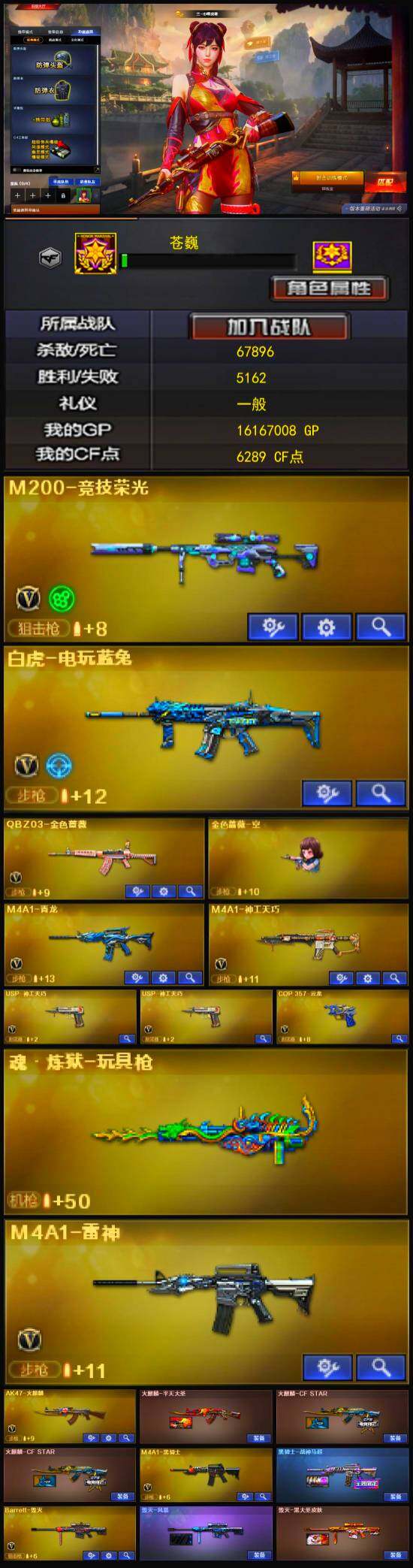 - [11278303]【商品标题】:江西一区-30V-4王者-1炫金 【热门武器】:QBZ03-金色蔷薇,M200-幻神,M200-竞技荣光,加特林-炼狱 【王者炫金武器】:炫金千变,王者风势 【稀有皮肤】:雷神-星空,火麒麟-心动糖果,毁灭-星空,M200-庆典-CFS 2021 【角色】:隼,蜀雪,狐影,炽天使,堕落女神,青霞仙子 【人偶武器】:AWM-灵狐-15周年嘉年华,灵狐娃娃手雷,生化手雷-机甲核心 【挑战大师】:神圣爆裂者-末日III,激光毁灭者III-白马银枪,冰龙粉碎者-白马银枪 【英雄级武器】:M200-竞技荣光,擎天-竞技荣光*2,高爆手雷-竞技荣光*3,烟雾弹-竞技荣光*4,闪光弹-竞技荣光*3,QBZ03-金色蔷薇,无影-神兵利器,M4A1-雷神,M4A1-黑龙,加特林-炼狱,AK47-火麒麟,AWM-天龙,Barrett-毁灭,AWM-裁决,M200-幻神,黑武士-锦绣游龙,黑骑士-海王,AK-47-猩红传说,沙鹰-天神,屠龙 【特殊枪械】:0白虎,0黑骑士,0烈龙,0盘龙,1炼狱,0蝴蝶斯泰尔