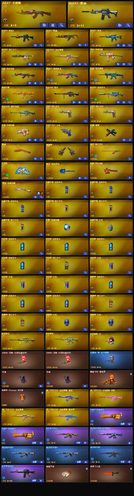 【英雄级武器】:AK47-火麒麟,M4A1-雷神,M4A1-黑骑士,AK47-黑鲨,M4A1-青龙,M4A1-神工天巧,无影-神兵利器,黑武士-锦绣游龙,QBZ03-金色蔷薇,烈火-动感闪耀,AK-47-猩红传说*2,白虎-电玩蓝兔,Barrett-毁灭,M200-竞技荣光,沙鹰-修罗,COP 357-云龙,USP-神工天巧*2,天神-动感闪耀,屠龙,麒麟刺,擎天-竞技荣光,唐刀-神工天巧,屠龙-动感闪耀,高爆手雷-竞技荣光*3,高爆手雷-神工天巧*3,手雷-动感闪耀,高爆手雷-云龙,闪光弹-竞技荣光*4,闪光弹-神工天巧,闪光弹-云龙*3,烟雾弹-竞技荣光*3,烟雾弹-神工天巧*2,烟雾弹-云龙*2