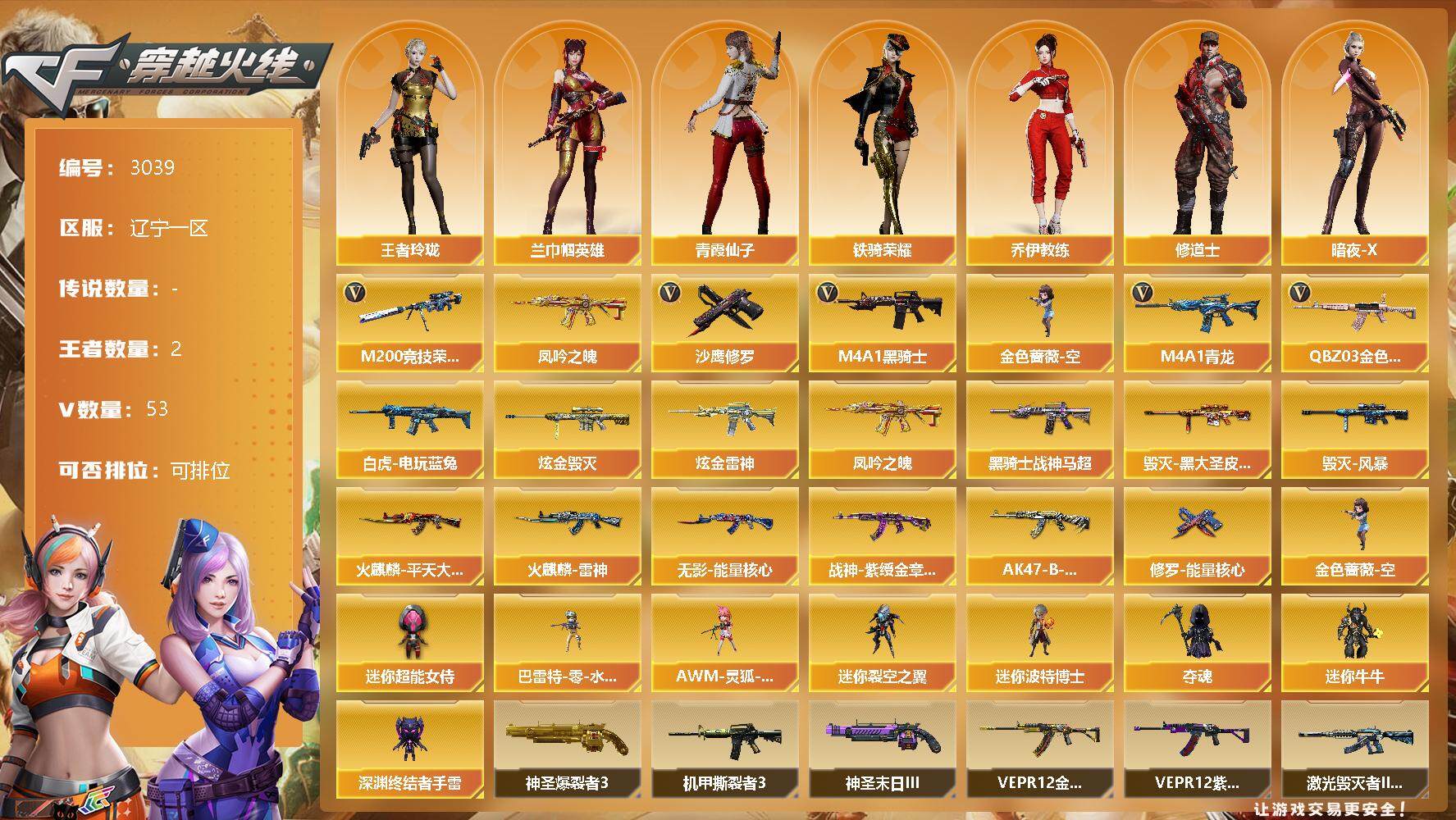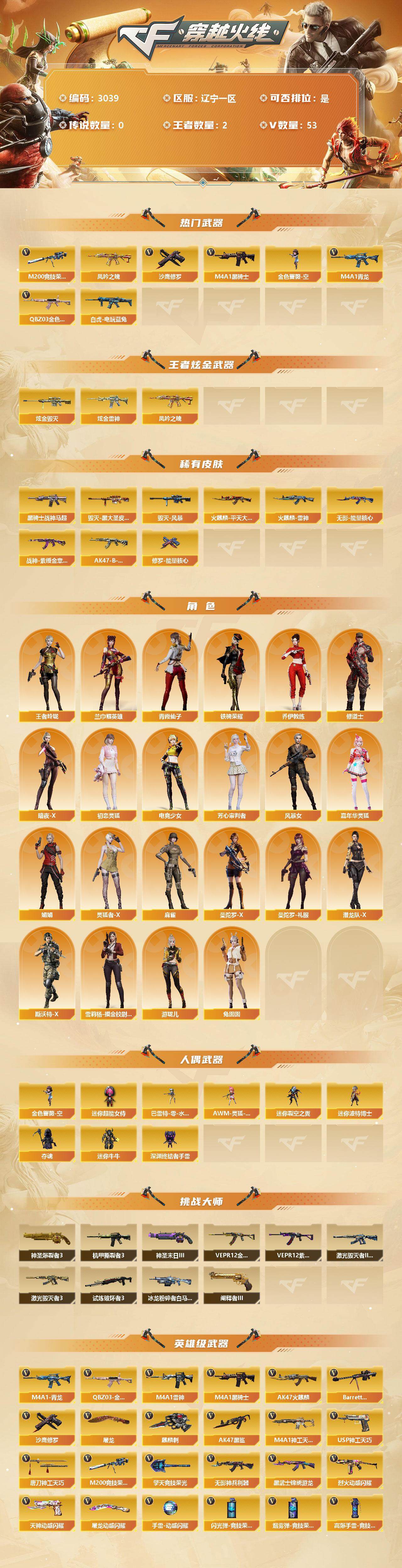 [13462648]辽宁一区-53V-2王者-2炫金 【热门武器】:QBZ03-金色蔷薇,M4A1-青龙,M200-竞技荣光,凤吟之魄,白虎-电玩蓝兔,M4A1-黑骑士,金色蔷薇-空,沙鹰-修罗 【王者炫金武器】:凤吟之魄,炫金雷神,炫金毁灭 【皮肤】:火麒麟-雷神,火麒麟-平天大圣,毁灭-黑大圣皮肤,毁灭-风暴,黑骑士-战神马超,无影-能量核心,战神-紫绶金章皮肤,AK47-B-常胜将军-刘备,修罗-能量核心 【角色】:兰-巾帼英雄,王者玲珑,乔伊教练,修道士,暗夜-X,初恋灵狐,电竞少女,芳心审判者,风暴女,嘉年华灵狐,娟娟,灵狐者-X,麻雀,曼陀罗-X,曼陀罗-礼服,潜龙队-X,青霞仙子,斯沃特-X,铁骑荣耀,兔囡囡,雪莉杨-摸金校尉,游珑儿 【人偶武器】:金色蔷薇-空,巴雷特-零-水下丽影,AWM-灵狐-15周年嘉年华*2,迷你裂空之翼*8,迷你波特博士*4,夺魂*2,迷你牛牛*2,深渊终结者手雷*2,迷你超能女侍 【挑战大师】:神圣爆裂者III*2,冰龙粉碎者-白马银枪,激光毁灭者III-白马银枪,VEPR-12-金魔*2,激光毁灭者III,机甲撕裂者III,试炼破坏者III,神圣爆裂者-末日III,阐释者III*4,VEPR-12-紫魔*2 【英雄级武器】:AK47-火麒麟,M4A1-雷神,M4A1-黑骑士,AK47-黑鲨,M4A1-青龙,M4A1-神工天巧,无影-神兵利器,黑武士-锦绣游龙,QBZ03-金色蔷薇,烈火-动感闪耀,AK-47-猩红传说*2,白虎-电玩蓝兔,Barrett-毁灭,M200-竞技荣光,沙鹰-修罗,COP 357-云龙,USP-神工天巧*2,天神-动感闪耀,屠龙,麒麟刺,擎天-竞技荣光,唐刀-神工天巧,屠龙-动感闪耀,高爆手雷-竞技荣光*3,高爆手雷-神工天巧*3,手雷-动感闪耀,高爆手雷-云龙,闪光弹-竞技荣光*4,闪光弹-神工天巧,闪光弹-云龙*3,烟雾弹-竞技荣光*3,烟雾弹-神工天巧*2,烟雾弹-云龙*2 【道具】:超级背包,灵魂忍者,变异宝贝,迷雾幽灵,夺命之镰,防化服,金色流光-枪王排位*2,星辰流光-枪王排位,枪王排位28赛季金色流光,枪王排位29赛季金色流光,语音特效-机器人,电玩兔兔表情,动感闪耀表情,防弹头盔*2,防弹衣*2,C4工具钳*2,手雷包*2 【特殊枪械】:1黑骑士