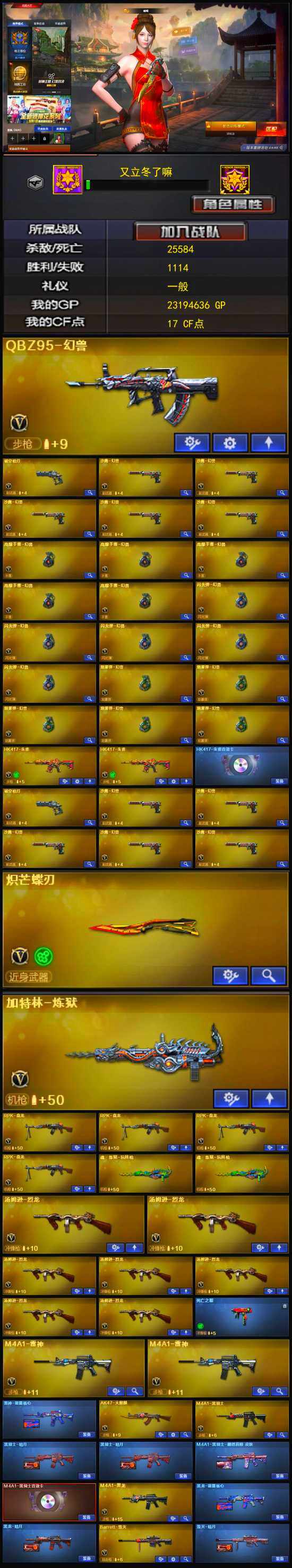 【热门武器】:HK417-朱雀*2,死亡之眼,M4A1-黑骑士,汤姆逊-烈龙*7,RPK-盘龙*4,加特林-炼狱,沙鹰-修罗*3,炽芒蝶刃,高爆手雷-幻兽*5