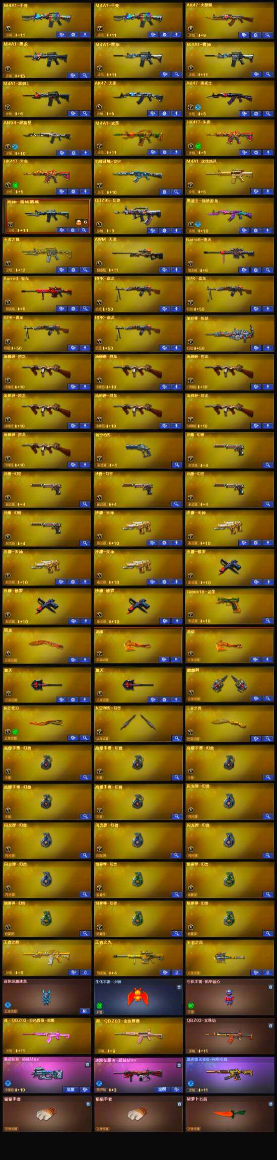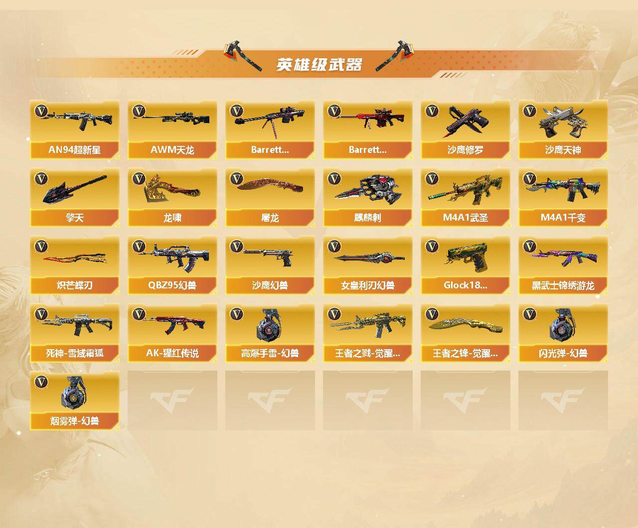 【英雄级武器】:M4A1-千变*2,AK47-火麒麟,M4A1-黑龙,M4A1-雷神*2,M4A1-黑骑士,AK47-无影,AK47-黑武士,AN94-超新星,M4A1-武圣,HK417-朱雀*2,黑武士-锦绣游龙,死神-雪域霜狐,M4A1-玫瑰精灵,QBZ95-幻兽,王者之戮-觉醒版,AK-47-猩红传说,AWM-天龙,Barrett-毁灭,Barrett-极光,RPK-盘龙*4,加特林-炼狱,汤姆逊-烈龙*7,沙鹰-修罗*3,沙鹰-天神*4,破空枪刃,沙鹰-幻兽*5,Glock18-武圣,屠龙,龙啸*2,擎天*2,麒麟刺,炽芒蝶刃,女皇利刃-幻兽,王者之锋-觉醒版,高爆手雷-幻兽*5,闪光弹-幻兽*5,烟雾弹-幻兽*5