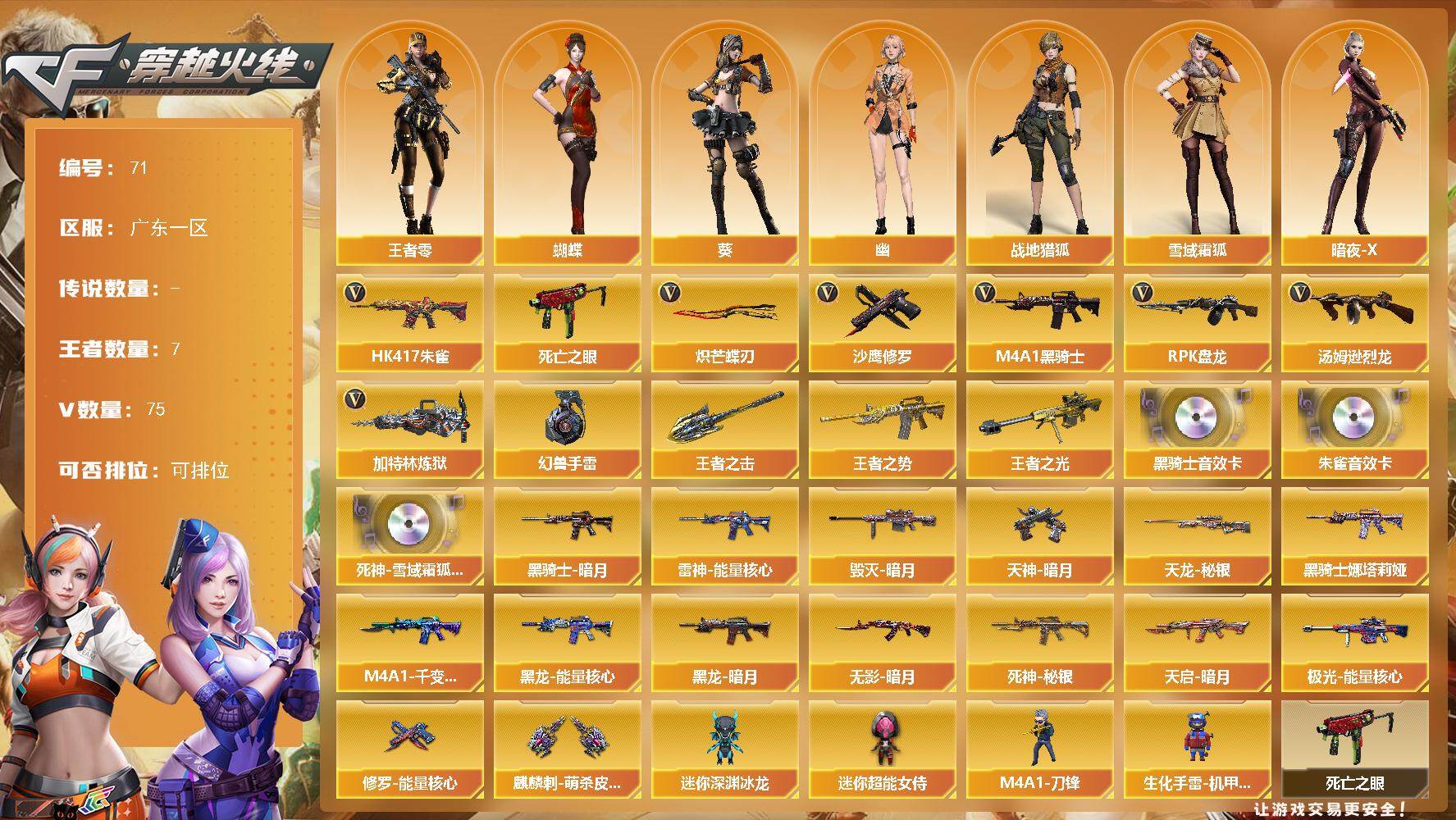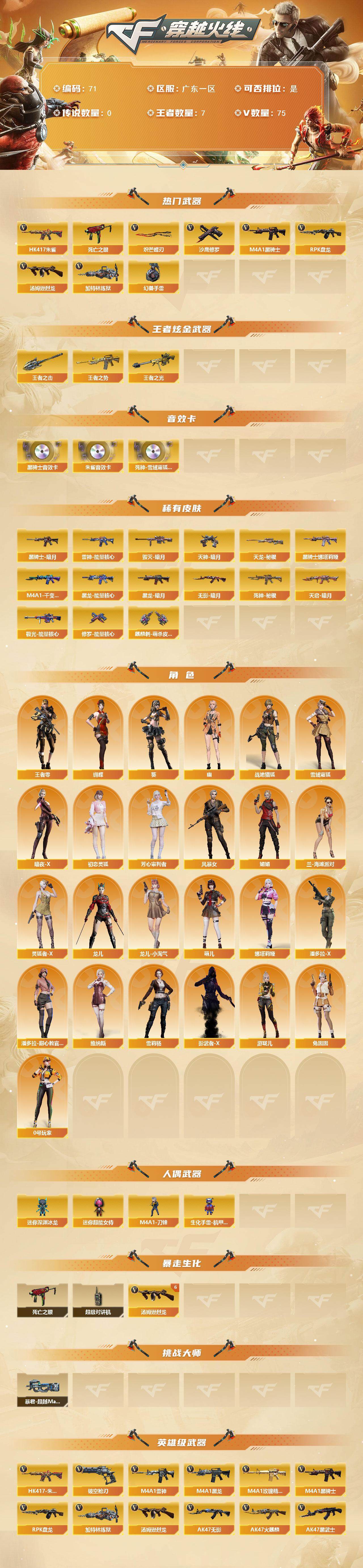 [13661574]广东一区-75V-7王者-0炫金 【热门武器】:HK417-朱雀*2,死亡之眼,M4A1-黑骑士,汤姆逊-烈龙*7,RPK-盘龙*4,加特林-炼狱,沙鹰-修罗*3,炽芒蝶刃,高爆手雷-幻兽*5 【王者炫金武器】:王者之势,王者之光,王者之击 【音效卡】:M4A1-黑骑士音效卡,HK417-朱雀音效卡,死神-雪域霜狐-怀旧音效卡 【皮肤】:雷神-能量核心,毁灭-暗月,M4A1-千变-孔明皮肤,黑龙-能量核心,黑龙-暗月,黑骑士-暗月*2,M4A1-黑骑士-娜塔莉娅 皮肤,无影-暗月*2,死神-秘银,天启-暗月*2,天龙-秘银,极光-能量核心,修罗-能量核心*2,天神-暗月*2,麒麟刺-萌杀皮肤 【角色】:葵,蝴蝶,战地猎狐,王者-零,雪域霜狐,暗夜-X,初恋灵狐,芳心审判者,风暴女*2,娟娟,兰-海滩派对,0号玩家,灵狐者-X,龙儿,龙儿-小淘气,萌儿,娜塔莉娅,潘多拉-X,潘多拉-甜心教官,兔囡囡,维纳斯,雪莉杨,影武者-X,幽,游珑儿 【人偶武器】:M4A1-刀锋,迷你深渊冰龙,生化手雷-机甲核心,迷你超能女侍 【暴走生化】:死亡之眼,超级对讲机 【挑战大师】:暴君乱世-超越Max 【英雄级武器】:M4A1-千变*2,AK47-火麒麟,M4A1-黑龙,M4A1-雷神*2,M4A1-黑骑士,AK47-无影,AK47-黑武士,AN94-超新星,M4A1-武圣,HK417-朱雀*2,黑武士-锦绣游龙,死神-雪域霜狐,M4A1-玫瑰精灵,QBZ95-幻兽,王者之戮-觉醒版,AK-47-猩红传说,AWM-天龙,Barrett-毁灭,Barrett-极光,RPK-盘龙*4,加特林-炼狱,汤姆逊-烈龙*7,沙鹰-修罗*3,沙鹰-天神*4,破空枪刃,沙鹰-幻兽*5,Glock18-武圣,屠龙,龙啸*2,擎天*2,麒麟刺,炽芒蝶刃,女皇利刃-幻兽,王者之锋-觉醒版,高爆手雷-幻兽*5,闪光弹-幻兽*5,烟雾弹-幻兽*5 【道具】:云山科技背包,战舰背包,炫彩背包,白狐背包,老虎背包,超级背包,雪域霜狐炫彩背包,救世主-黑桃战神,绿色巨人,灵魂忍者,变异宝贝,迷雾幽灵,生化弹匣,夺命之镰,防化服*3,金色流光-枪王排位,星辰流光-枪王排位,枪王排位28赛季金色流光,语音特效-怀旧,雪域霜狐表情,热带奇洋表情,斯沃特表情,EP战队名片,EP战队喷图,防弹头盔*3,防弹衣*3,C4工具