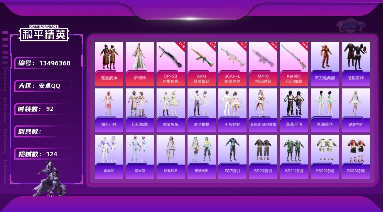 [13496368]不可二次【店主推荐捡漏号!可直接换绑】 安卓 手Q-2粉装-5特效枪-1粉色飞行器-3.6w热力值-13王牌印记-92套装-124枪皮【热门品类】:角色-军刀雅典娜,套装-暗影哥特,套装-粉红小猪【粉色套装】:粉装-霓裳武神,角色-萨利娅【粉色枪皮等级】:AKM-绿萝繁花(五级),SCAR-L-锦绣绵绵(五级),M416-电玩时刻(五级),Kar98K-巳巳如意(五级),DP-28-豹影疾电(五级)【粉色飞行器】:闪光银龙飞行器