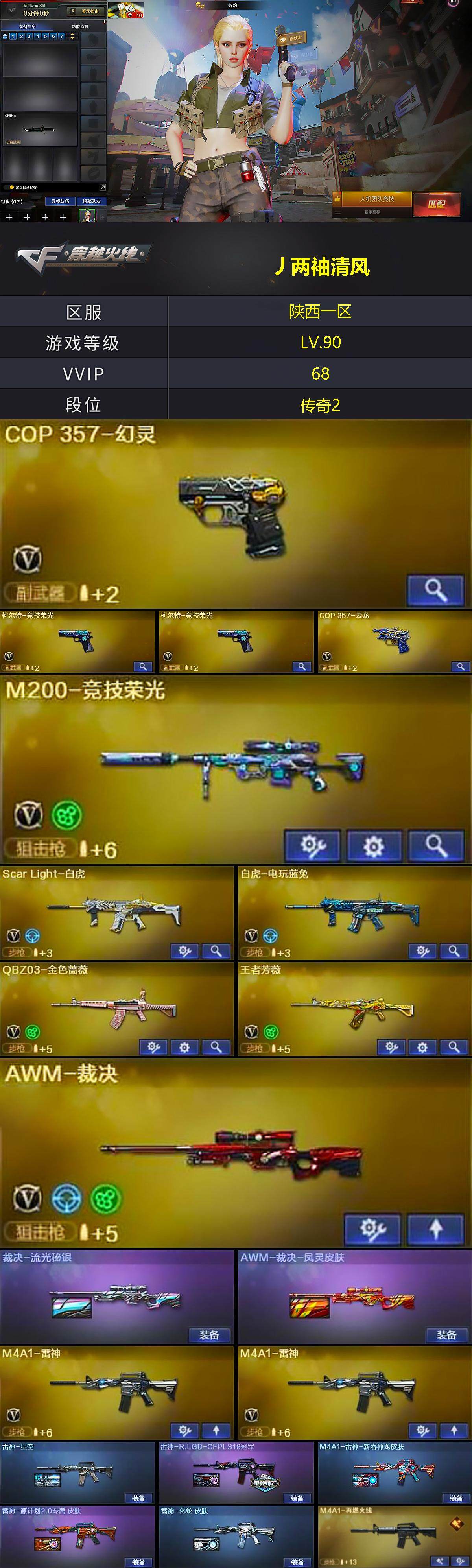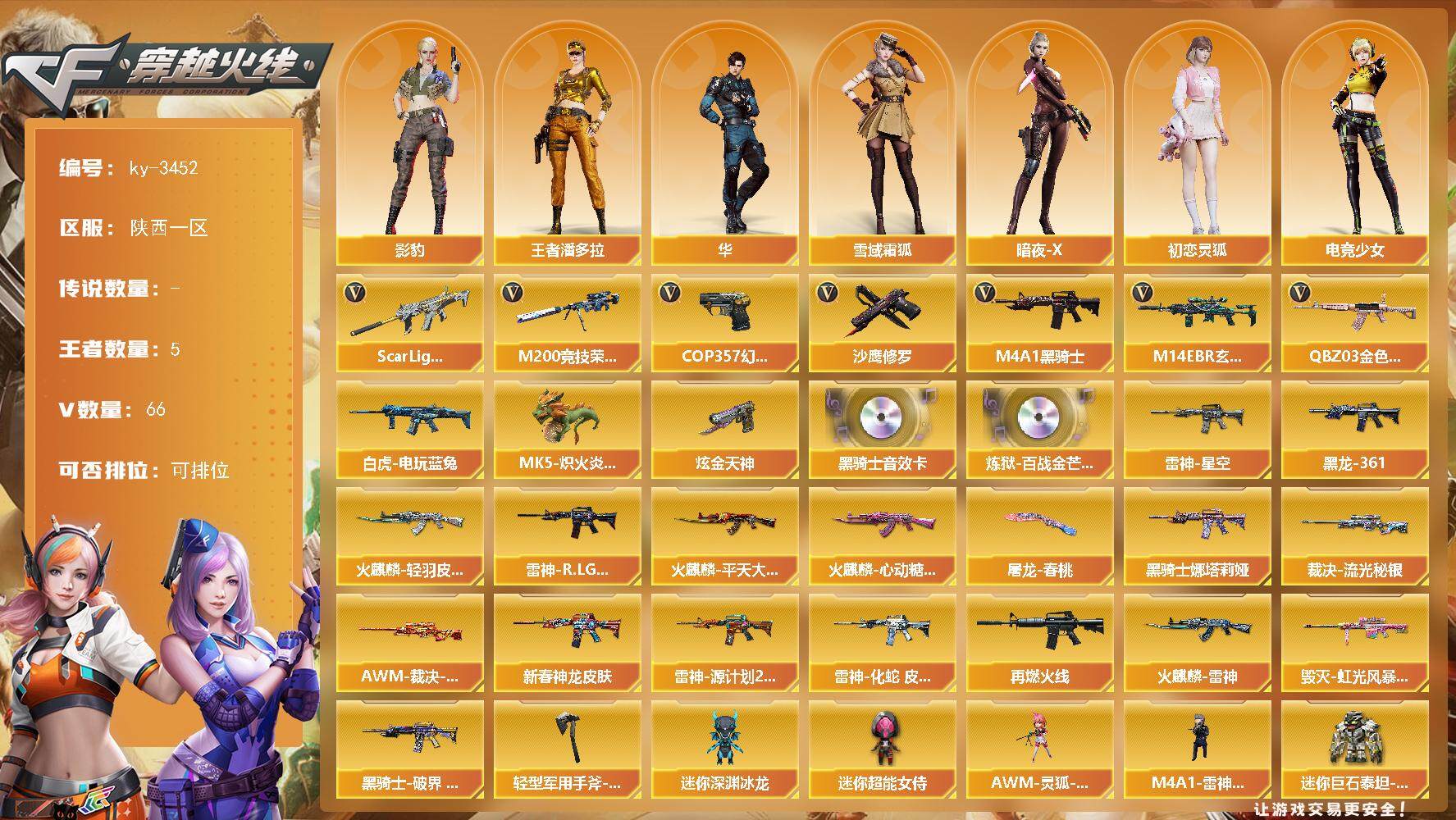[13687344]陕西一区-66V-5王者-1炫金 【热门武器】:QBZ03-金色蔷薇,M14EBR-玄武,Scar Light-白虎,M200-竞技荣光,白虎-电玩蓝兔,M4A1-黑骑士,MK5-炽火炎龙,COP 357-幻灵,沙鹰-修罗*5 【王者炫金武器】:炫金天神 【音效卡】:M4A1-黑骑士音效卡,炼狱-百战金芒-庆典舞曲音效卡 【皮肤】:裁决-流光秘银,AWM-裁决-凤灵皮肤,雷神-星空,雷神-R.LGD-CFPLS18冠军,M4A1-雷神-新春神龙皮肤,雷神-源计划2.0专属 皮肤,雷神-化蛇 皮肤,M4A1-再燃火线,火麒麟-雷神,火麒麟-轻羽皮肤,火麒麟-平天大圣*3,火麒麟-心动糖果,毁灭-虹光风暴 皮肤,M4A1-黑龙-361,M4A1-黑骑士-娜塔莉娅 皮肤,黑骑士-破界 皮肤,屠龙-春桃 皮肤,轻型军用手斧-再燃火线 【角色】:影豹,华,王者潘多拉,雪域霜狐,暗夜-X,初恋灵狐,电竞少女,芳心审判者,飞虎队-X,风暴女*2,嘉年华灵狐,猎狐者-追月,0号玩家,灵狐-花神,灵狐者-X,灵狐者-七夕宝贝,龙儿,曼陀罗-X,潘多拉-X,斯沃特-X,兔囡囡,游珑儿 【人偶武器】:M4A1-雷神-精英刀锋,MK5-炽火炎龙,AWM-灵狐-15周年嘉年华,迷你深渊冰龙,迷你牛魔王,黄金迷你裂空之翼,夺魂,迷你牛牛*3,生化手雷-机甲核心,深渊终结者手雷,迷你超能女侍,迷你巨石泰坦-魔花研究所 【暴走生化】:超级对讲机 【挑战大师】:冰龙粉碎者-白马银枪,神圣爆裂者-末日III 【英雄级武器】:AK47-火麒麟,M4A1-黑龙,M4A1-雷神*2,M4A1-黑骑士,AN94-超新星,M4A1-龙血,Scar Light-白虎,M14EBR-玄武,无影-神兵利器,黑武士-锦绣游龙,QBZ03-独角-III,QBZ03-金色蔷薇,AK-47-猩红传说,AK47-B-战神,黑骑士-海王,白虎-电玩蓝兔,王者芳薇-觉醒版,Barrett-毁灭,AWM-裁决,M200-竞技荣光,炼狱-百战金芒,炼狱-悦蓝-觉醒版,沙鹰-修罗*5,COP 357-幻灵,柯尔特-竞技荣光*2,COP 357-云龙,屠龙,麒麟刺,幻灵之锋*2,擎天-竞技荣光,麒麟刺-百战金芒,高爆手雷-幻灵*3,高爆手雷-竞技荣光,高爆手雷-云龙*6,闪光弹-幻灵*3,闪光弹-竞技荣光,闪光弹-云龙*2,烟雾弹-幻灵