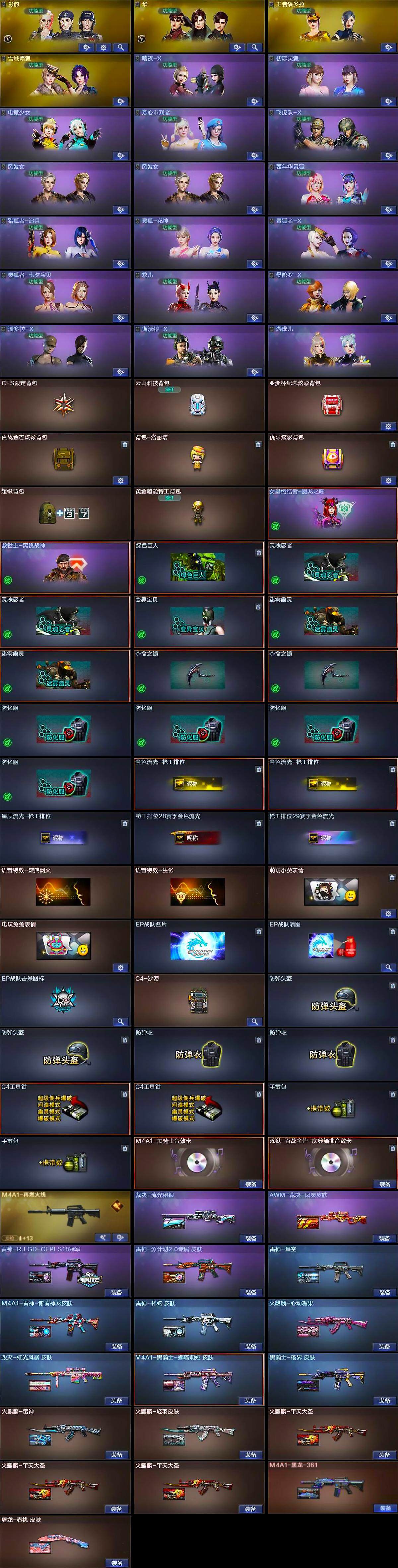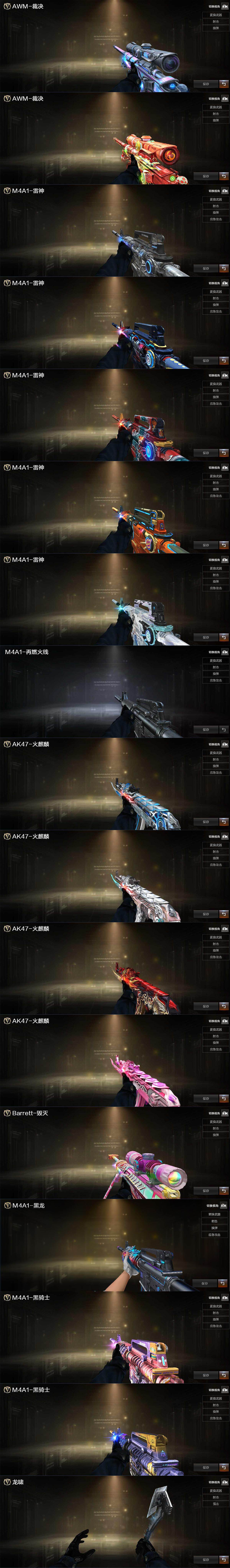 【皮肤】:裁决-流光秘银,AWM-裁决-凤灵皮肤,雷神-星空,雷神-R.LGD-CFPLS18冠军,M4A1-雷神-新春神龙皮肤,雷神-源计划2.0专属 皮肤,雷神-化蛇 皮肤,M4A1-再燃火线,火麒麟-雷神,火麒麟-轻羽皮肤,火麒麟-平天大圣*3,火麒麟-心动糖果,毁灭-虹光风暴 皮肤,M4A1-黑龙-361,M4A1-黑骑士-娜塔莉娅 皮肤,黑骑士-破界 皮肤,屠龙-春桃 皮肤,轻型军用手斧-再燃火线