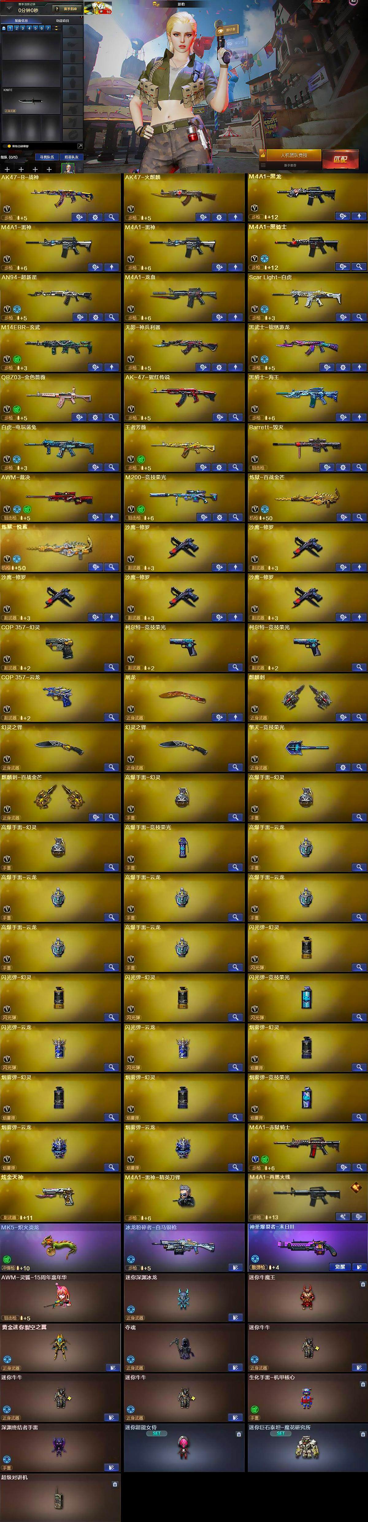 【人偶武器】:M4A1-雷神-精英刀锋,MK5-炽火炎龙,AWM-灵狐-15周年嘉年华,迷你深渊冰龙,迷你牛魔王,黄金迷你裂空之翼,夺魂,迷你牛牛*3,生化手雷-机甲核心,深渊终结者手雷,迷你超能女侍,迷你巨石泰坦-魔花研究所