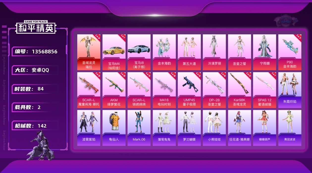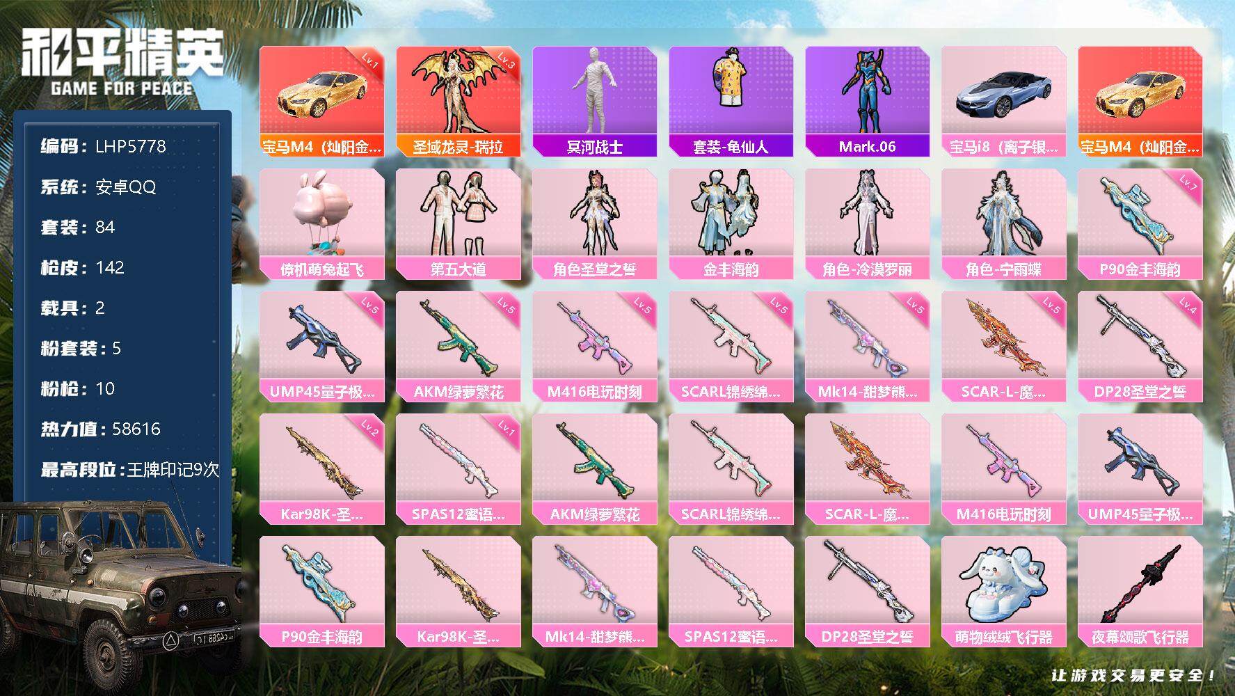 [13568856]600璀璨碎片/老木乃伊安卓 手Q-1神装-5粉装-10特效枪-2载具-6粉色飞行器-58616热力值-9王牌印记-84套装-142枪皮【红色载具】:宝马M4(灿阳金)(一级)【红色神装等级】:圣域龙灵-瑞拉(三级)【红色角色神装】:圣域龙灵-瑞拉【热门品类】:套装-冥河战士,套装-龟仙人,角色-Mark.06【粉色载具】:宝马i8(离子银),宝马M4(灿阳金),僚机-萌兔起飞【粉色套装】:粉装-第五大道,角色-圣堂之誓,粉装-金丰海韵,角色-冷漠罗丽,角色-宁雨蝶【粉色枪皮等级】:AKM-绿萝繁花(五级),SCAR-L-锦绣绵绵(五级),SCAR-L-魔童闹海 哪吒(五级),M416-电玩时刻(五级),UMP45-量子极限(五级),P90-金丰海韵(七级),Kar98K-圣域龙灵(二级),Mk14-甜梦熊击(五级),SPAS-12-蜜语绒猫(一级),DP-28-圣堂之誓(四级)【粉色枪皮】:AKM-绿萝繁花,SCAR-L-锦绣绵绵,SCAR-L-魔童闹海 哪吒,M416-电玩时刻,UMP45-量子极限,P90-金丰海韵,Kar98K-圣域龙灵,Mk14-甜梦熊击,SPAS-12-蜜语绒猫,DP-28-圣堂之誓【粉色飞行器】:萌物绒绒飞行器,夜幕颂歌飞行器,繁龙极客飞行器,圣域金龙飞行器,雀灵庇佑飞行器,终晖之翼飞行器