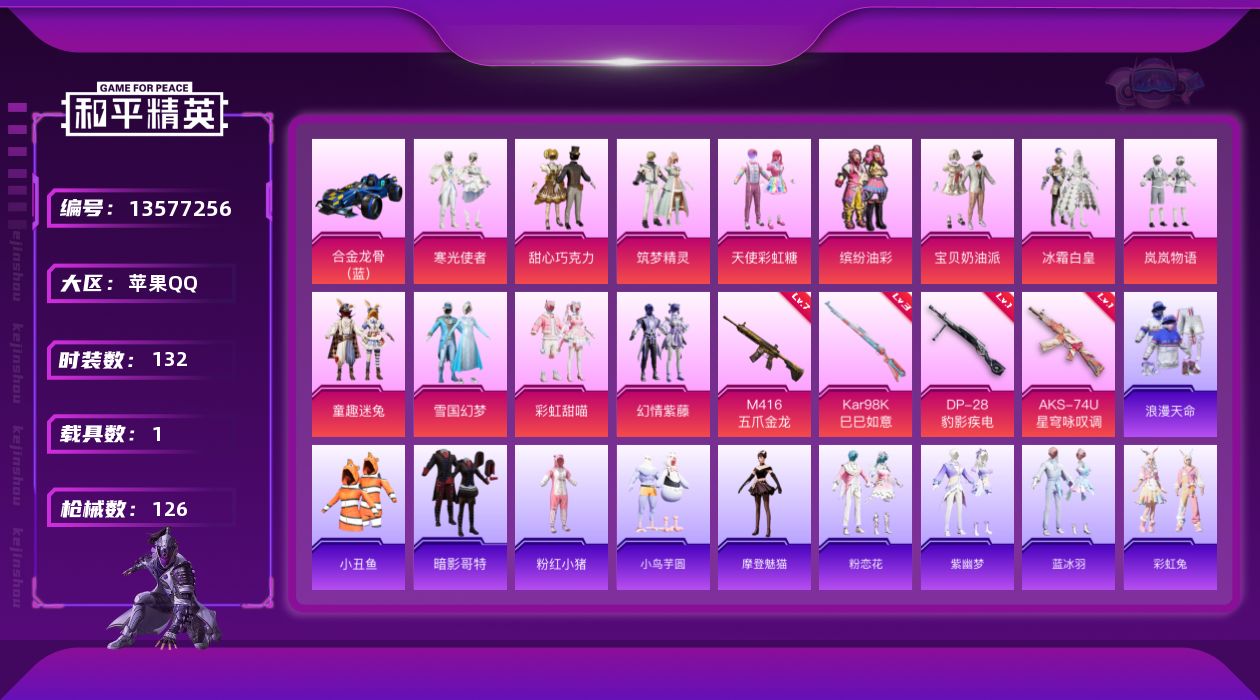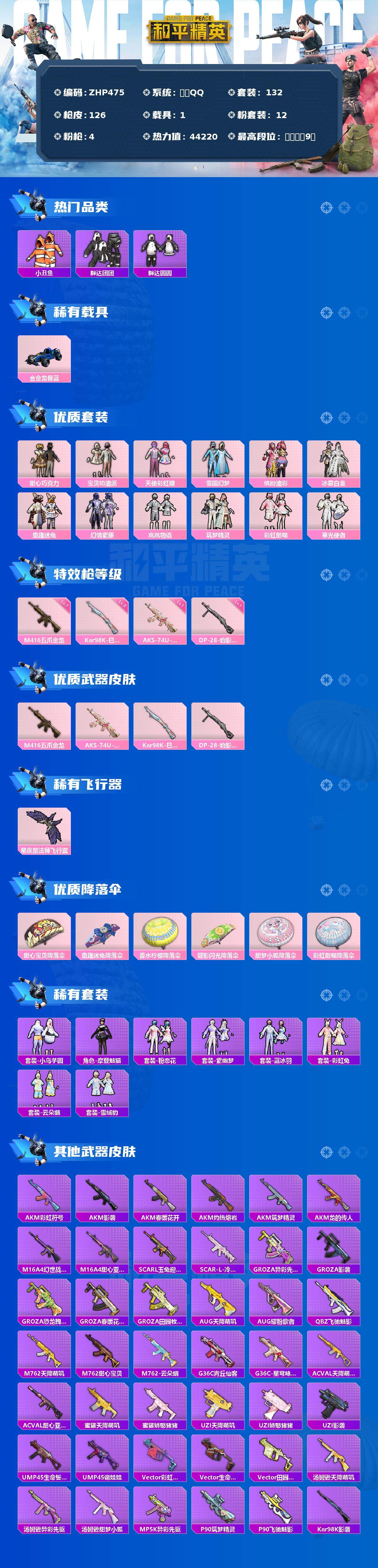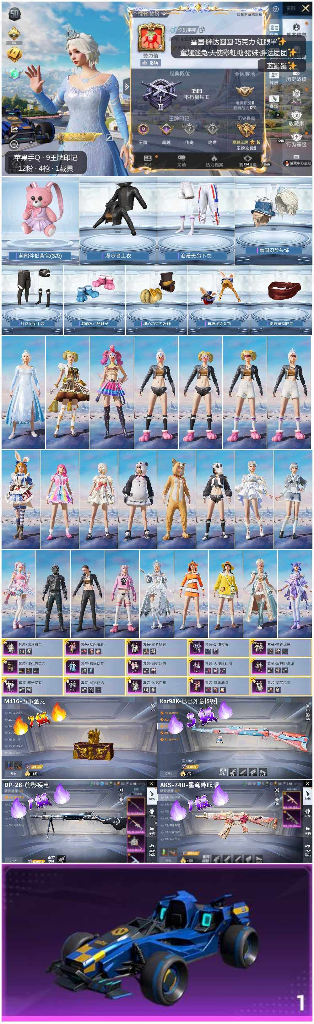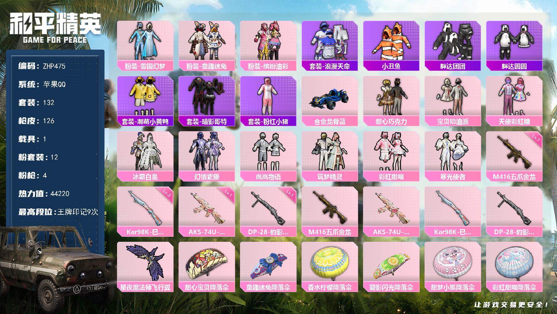 [13577256]雪国幻梦!巧克力三姐妹!苹果 手Q-12粉装-4特效枪-1载具-1粉色飞行器-44220热力值-9王牌印记-132套装-126枪皮 【热门品类】:粉装-雪国幻梦,粉装-童趣迷兔,粉装-缤纷油彩,套装-浪漫天命,套装-小丑鱼,套装-胖达团团,套装-胖达圆圆,套装-潮萌小黄鸭,套装-暗影哥特,套装-粉红小猪 【粉色载具】:合金龙骨(蓝) 【粉色套装】:粉装-甜心巧克力,粉装-宝贝奶油派,粉装-天使彩虹糖,粉装-雪国幻梦,粉装-缤纷油彩,粉装-冰霜白皇,粉装-童趣迷兔,粉装-幻情紫藤,粉装-岚岚物语,粉装-筑梦精灵,粉装-彩虹甜喵,粉装-寒光使者 【粉色枪皮等级】:M416-五爪金龙(七级),AKS-74U-星穹咏叹调(一级),Kar98K-巳巳如意(三级),DP-28-豹影疾电(一级) 【粉色枪皮】:M416-五爪金龙,AKS-74U-星穹咏叹调,Kar98K-巳巳如意,DP-28-豹影疾电 【粉色飞行器】:星夜魔法师飞行翼 【粉色降落伞】:甜心宝贝降落伞,童趣迷兔降落伞,香水柠檬降落伞,碧影闪光降落伞,甜梦小狐降落伞,彩虹甜喵降落伞 【稀有套装】:套装-小鸟芋圆,角色-摩登魅猫,套装-粉恋花,套装-紫幽梦,套装-蓝冰羽,套装-彩虹兔,套装-云朵鹅,套装-雪绒豹 【稀有枪皮】:AKM-彩虹符号,AKM-影袭,AKM-春暖花开,AKM-灼热熔岩,AKM-筑梦精灵,AKM-龙的传人,M16A4-幻世战舞者,M16A4-甜心亚梦,SCAR-L-玉兔迎春,SCAR-L-冷漠罗丽,GROZA-异彩先驱,GROZA-影袭,GROZA-恐龙拽拽,GROZA-春暖花开,GROZA-田园牧歌,AUG-天降萌叽,AUG-耀粉歌者,QBZ-飞驰魅影,M762-天降萌叽,M762-甜心宝贝,M762-云朵鹅,G36C-青丘仙客,G36C-星穹咏叹调,AC-VAL-天降萌叽,AC-VAL-甜心亚梦,蜜獾-天降萌叽,蜜獾-娇憨猪猪,UZI-天降萌叽,UZI-娇憨猪猪,UZI-影袭,UMP45-生命誓言,UMP45-诡娃娃,Vector-彩虹符号,Vector-生命誓言,Vector-田园牧歌,汤姆逊-天降萌叽,汤姆逊-异彩先驱,汤姆逊-甜梦小狐,MP5K-异彩先驱,P90-筑梦精灵,P90-飞驰魅影,Kar98K-影袭,Kar98K-炫彩节奏,Kar98K-飞驰魅影,M24-影袭,M24-炫彩节