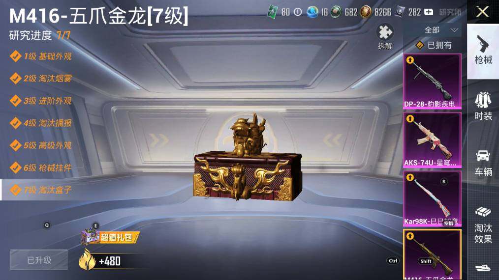 【粉色枪皮等级】:M416-五爪金龙(七级),AKS-74U-星穹咏叹调(一级),Kar98K-巳巳如意(三级),DP-28-豹影疾电(一级)