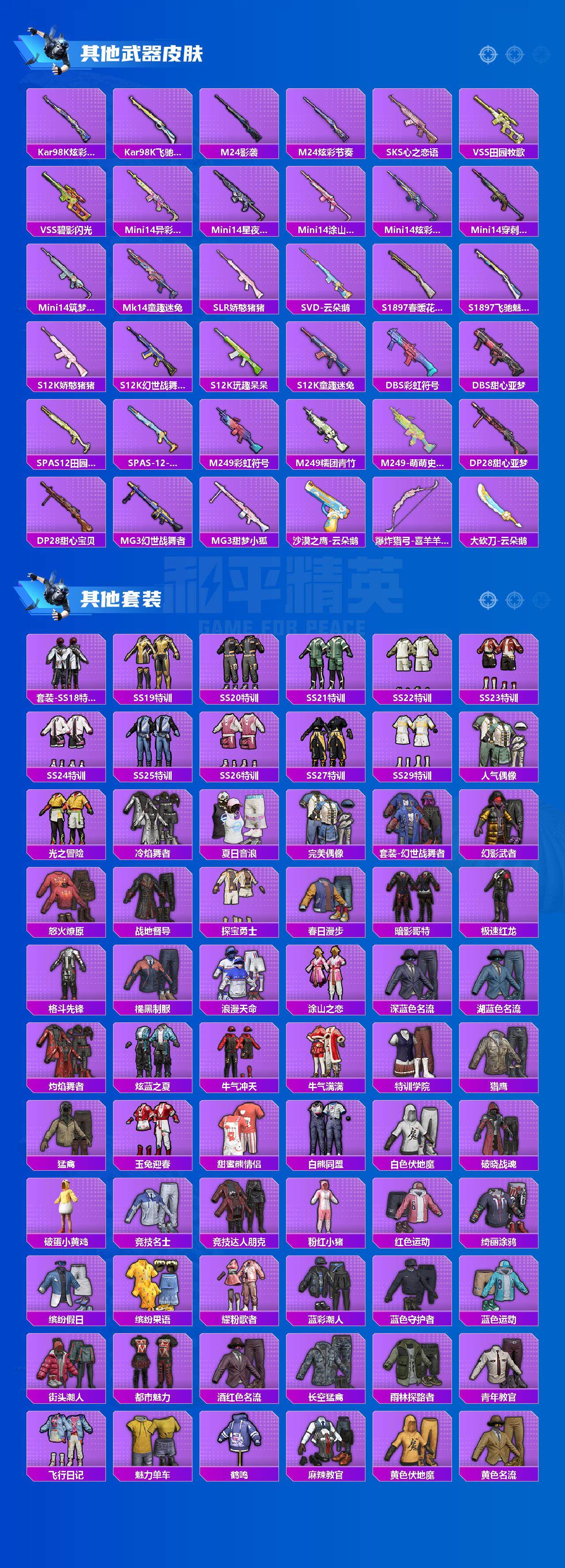 【稀有枪皮】:AKM-彩虹符号,AKM-影袭,AKM-春暖花开,AKM-灼热熔岩,AKM-筑梦精灵,AKM-龙的传人,M16A4-幻世战舞者,M16A4-甜心亚梦,SCAR-L-玉兔迎春,SCAR-L-冷漠罗丽,GROZA-异彩先驱,GROZA-影袭,GROZA-恐龙拽拽,GROZA-春暖花开,GROZA-田园牧歌,AUG-天降萌叽,AUG-耀粉歌者,QBZ-飞驰魅影,M762-天降萌叽,M762-甜心宝贝,M762-云朵鹅,G36C-青丘仙客,G36C-星穹咏叹调,AC-VAL-天降萌叽,AC-VAL-甜心亚梦,蜜獾-天降萌叽,蜜獾-娇憨猪猪,UZI-天降萌叽,UZI-娇憨猪猪,UZI-影袭,UMP45-生命誓言,UMP45-诡娃娃,Vector-彩虹符号,Vector-生命誓言,Vector-田园牧歌,汤姆逊-天降萌叽,汤姆逊-异彩先驱,汤姆逊-甜梦小狐,MP5K-异彩先驱,P90-筑梦精灵,P90-飞驰魅影,Kar98K-影袭,Kar98K-炫彩节奏,Kar98K-飞驰魅影,M24-影袭,M24-炫彩节