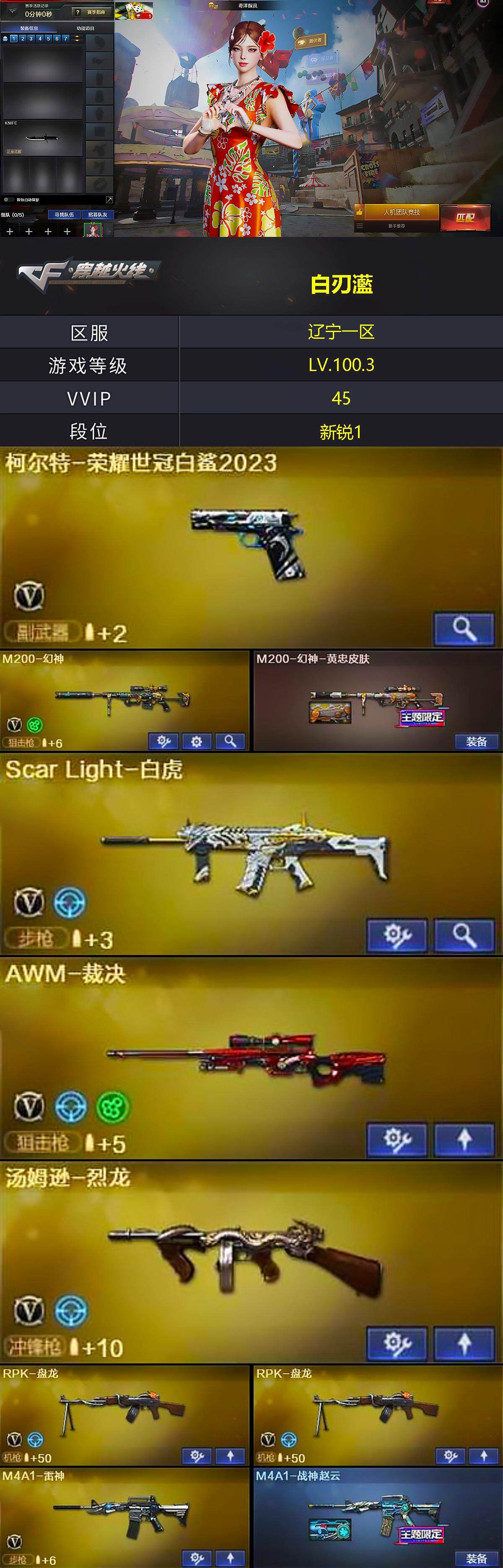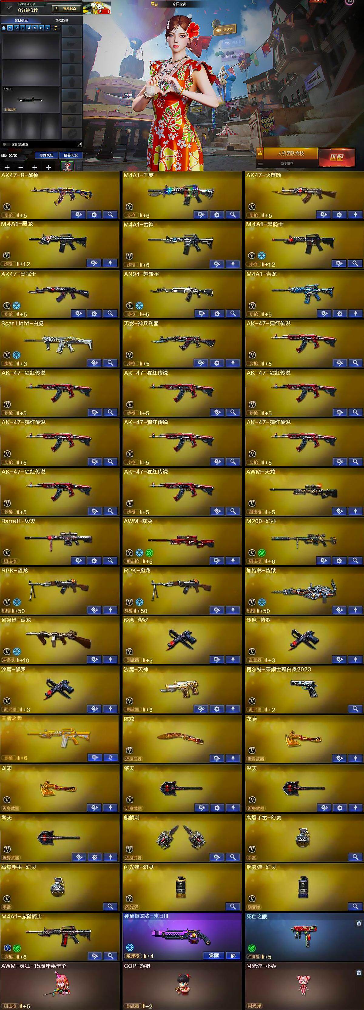 【热门武器】:Scar Light-白虎,M4A1-青龙,M200-幻神,柯尔特-荣耀世冠白鲨2023,死亡之眼,M4A1-黑骑士,汤姆逊-烈龙,RPK-盘龙*2,加特林-炼狱,沙鹰-修罗*3