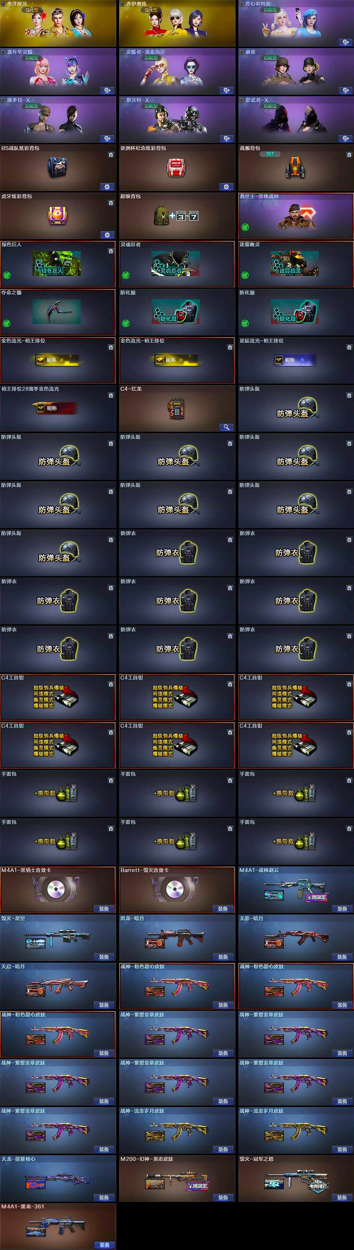 【道具】:BS战队炫彩背包,亚洲杯纪念炫彩背包,战舰背包,虎牙炫彩背包,超级背包,救世主-黑桃战神,绿色巨人,灵魂忍者,迷雾幽灵,夺命之镰,防化服*2,金色流光-枪王排位*2,星辰流光-枪王排位,枪王排位28赛季金色流光,C4-红龙,防弹头盔*8,防弹衣*8,C4工具钳*6,手雷包*6