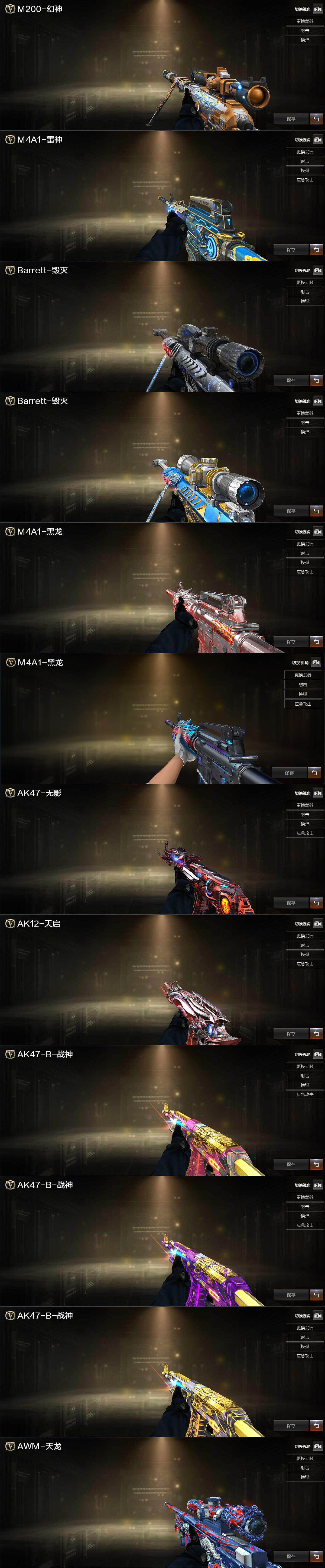 【皮肤】:M200-幻神-黄忠皮肤,M4A1-战神赵云,毁灭-星空,毁灭-冠军之怒,黑龙-暗月,M4A1-黑龙-361,无影-暗月,天启-暗月,战神-粉色甜心皮肤*3,战神-紫绶金章皮肤*6,战神-流金岁月皮肤*2,天龙-能量核心