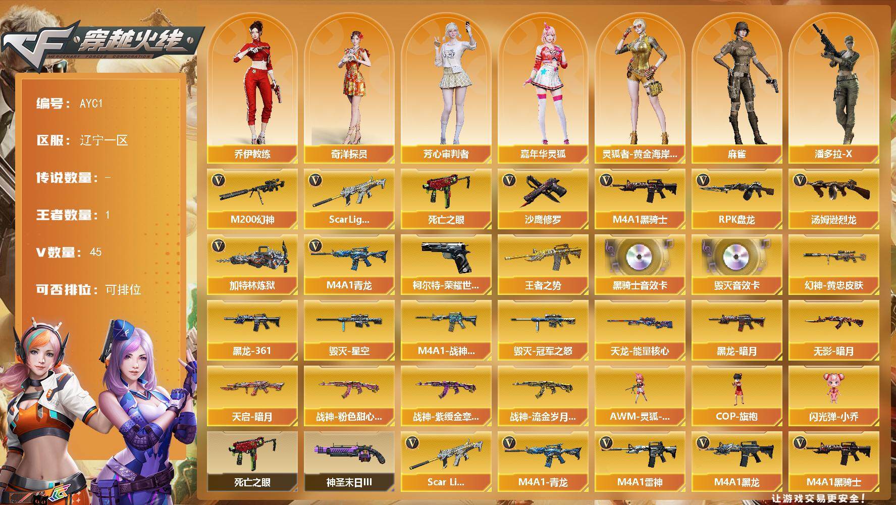 [13712774]辽宁一区-45V-1王者-0炫金 【热门武器】:Scar Light-白虎,M4A1-青龙,M200-幻神,柯尔特-荣耀世冠白鲨2023,死亡之眼,M4A1-黑骑士,汤姆逊-烈龙,RPK-盘龙*2,加特林-炼狱,沙鹰-修罗*3 【王者炫金武器】:王者之势 【音效卡】:M4A1-黑骑士音效卡,Barrett-毁灭音效卡 【皮肤】:M200-幻神-黄忠皮肤,M4A1-战神赵云,毁灭-星空,毁灭-冠军之怒,黑龙-暗月,M4A1-黑龙-361,无影-暗月,天启-暗月,战神-粉色甜心皮肤*3,战神-紫绶金章皮肤*6,战神-流金岁月皮肤*2,天龙-能量核心 【角色】:奇洋探员,乔伊教练,芳心审判者,嘉年华灵狐,灵狐者-黄金海岸,麻雀,潘多拉-X,斯沃特-X,兔囡囡,影武者-X 【人偶武器】:AWM-灵狐-15周年嘉年华,COP-旗袍,闪光弹-小乔 【暴走生化】:死亡之眼 【挑战大师】:神圣爆裂者-末日III 【英雄级武器】:M4A1-千变,AK47-火麒麟,M4A1-黑龙,M4A1-雷神,M4A1-黑骑士,AK47-黑武士,AN94-超新星,M4A1-青龙,Scar Light-白虎,无影-神兵利器,AK-47-猩红传说*9,AK47-B-战神,AWM-天龙,Barrett-毁灭,AWM-裁决,M200-幻神,RPK-盘龙*2,加特林-炼狱,汤姆逊-烈龙,沙鹰-修罗*3,沙鹰-天神,柯尔特-荣耀世冠白鲨2023,屠龙,龙啸*2,擎天*3,麒麟刺,高爆手雷-幻灵*2,闪光弹-幻灵,烟雾弹-幻灵,M4A1-赤狱骑士 【道具】:BS战队炫彩背包,亚洲杯纪念炫彩背包,战舰背包,虎牙炫彩背包,超级背包,救世主-黑桃战神,绿色巨人,灵魂忍者,迷雾幽灵,夺命之镰,防化服*2,金色流光-枪王排位*2,星辰流光-枪王排位,枪王排位28赛季金色流光,C4-红龙,防弹头盔*8,防弹衣*8,C4工具钳*6,手雷包*6 【特殊枪械】:1白虎,1黑骑士,1烈龙,2盘龙,1炼狱