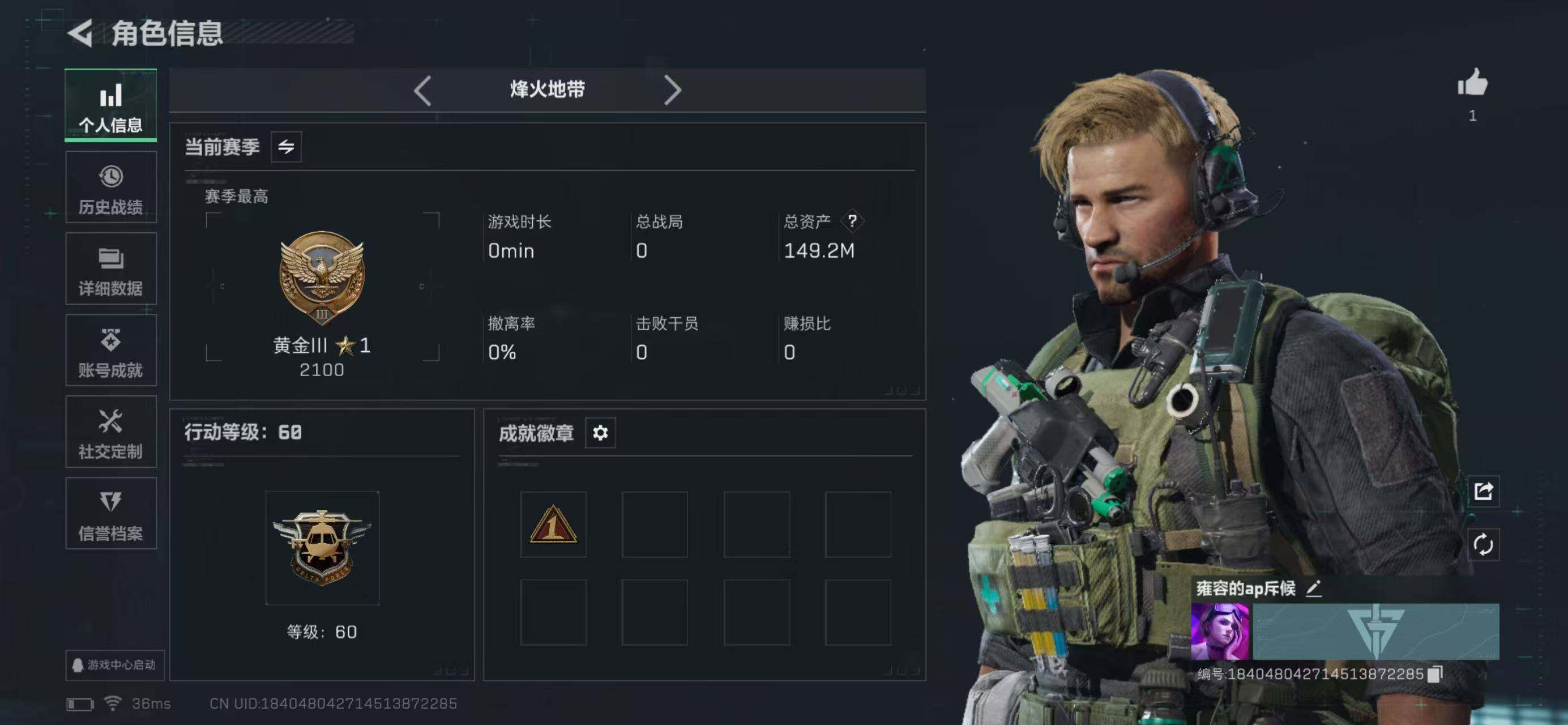 [13712954]【店主推荐捡漏号!可直接换绑】总资产149m -135m流动资产-60烽火等级-黄金-1战场等级-无军衔