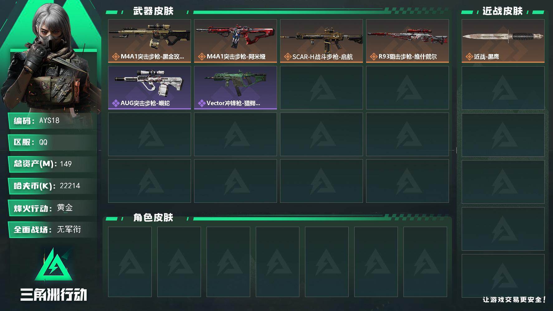 [13712954]【店主推荐捡漏号!可直接换绑】总资产149m -135m流动资产-60烽火等级-黄金-1战场等级-无军衔 【近战皮肤】:近战-黑鹰 【传说级普通外观】:M4A1突击步枪-蚀金玫瑰,M4A1突击步枪-阿米娅,SCAR-H战斗步枪-启航,R93狙击步枪-维什戴尔 【史诗级普通外观】:AUG突击步枪-蝮蛇,Vector冲锋枪-猎鳄行动 【稀有级普通外观】:SCAR-H战斗步枪-荣耀列队,SMG-45-行动开启,M1014霰弹枪-幻影结构,SV-98狙击步枪-星链科技 【普通级普通外观】:M4A1突击步枪-高雅黑,M4A1突击步枪-海色,QBZ95-1突击步枪-高雅黑,QBZ95-1突击步枪-海浪,K416突击步枪-几何迷彩,M16A4突击步枪-三角洲力量,AUG突击步枪-浅蓝涂装,SG552突击步枪-浅蓝涂装,SG552突击步枪-海浪,UZI冲锋枪-海色,M1014霰弹枪-高雅黑,M1014霰弹枪-海浪,SV-98狙击步枪-红色涂装,沙漠之鹰-海浪 【军牌】:军牌-展示,军牌-信誉优秀 【挂饰】:挂饰-维什戴尔,挂饰-阿萨拉霰弹兵,挂饰-诡影狙击兵,挂饰-启程,挂饰-阿萨拉徽章
