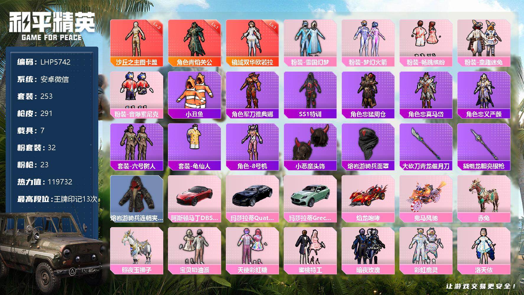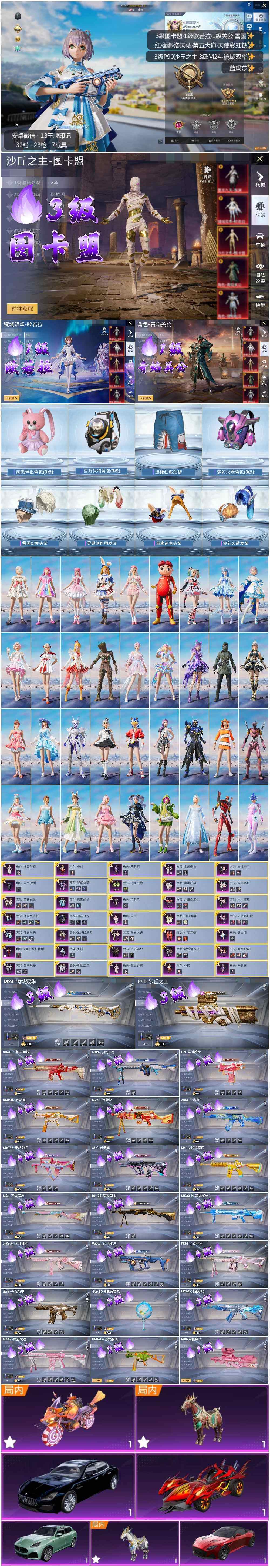 [13131157]素材身法号 安卓 微信-3神装-32粉装-23特效枪-7载具-8粉色飞行器-11.9w热力值-13王牌印记-253套装-291枪皮【红色神装等级】:镜域双华-欧若拉(一级),沙丘之主-图卡盟(三级),角色-青焰关公(一级)【热门品类】:粉装-雪国幻梦,粉装-梦幻火箭,粉装-畅跳缤纷,粉装-童趣迷兔,粉装-音爆索尼克,套装-小丑鱼,角色-军刀雅典娜,套装-SS1特训,角色-忠猛周仓,角色-忠真马岱,角色-忠义严颜,套装-六号树人,套装-龟仙人,角色-8号机,小恶魔头饰,熔岩游骑兵面罩,大砍刀-青龙偃月刀,撬棍-龙胆亮银枪,熔岩游骑兵连帽夹克【粉色载具】:阿斯顿马丁DBS(红),玛莎拉蒂Quattroporte(夜幕蓝),玛莎拉蒂Grecale(薄荷绿),焰龙咆哮,鬼马风驰,赤兔,照夜玉狮子【粉色套装】:粉装-宝贝奶油派,粉装-天使彩虹糖,粉装-雪国幻梦,粉装-梦幻火箭,粉装-童趣迷兔,粉装-蜜桃特工,粉装-暗夜玫瑰,粉装-彩虹鹿灵,角色-洛天依,角色-2号机款机体服,粉装-恐龙拽拽,粉装-紫电风暴,粉装-灵感创作师,粉装-旋转彩虹,粉装-冰川粉黛,粉装-冰川幽秘,粉装-冰川红玫,粉装-暗夜鎏金,粉装-海螺星光,粉装-音爆索尼克,粉装-畅跳缤纷,粉装-第五大道,粉装-仲夏莫吉托,粉装-闲梦青缨,角色-茉莉星,角色-宙之时溯,玩偶服-猪猪侠,角色-烟云彩露,角色-严莉莉,角色-小蓝,角色-美雪,角色-美琪【粉色枪皮等级】:AKM-百合蜜语(四级),SCAR-L-桃夭倾城(四级),M416-暖熊萌萌(四级),GROZA-旋转彩虹(四级),AUG-超新星(四级),M762-冷魅冰骑(三级),蜜獾-辉耀战甲(三级),UZI-畅跳缤纷(四级),UMP45-恐龙拽拽(二级),UMP45-启明星(四级),Vector-环太平洋(四级),汤姆逊-冰川粉黛(四级),P90-粉樱探戈(一级),P90-沙丘之主(三级),M24-莲影清波(四级),M24-镜域双华(三级),M417-第五大道(三级),MK20-H-海螺星光(四级),M249-猪猪侠(四级),DP-28-暗夜鎏金(四级),MG3-洛神天依(四级),PKM-江南烟雨(四级),平底锅-仲夏莫吉托(三级)【粉色飞行器】:扶摇飞仙飞行器,甜梦小狐飞行器,畅跳缤纷飞行器,粉樱探戈飞行器,萌物绒绒飞行器,沙丘之主天马,镜域双华-灵镜之阶