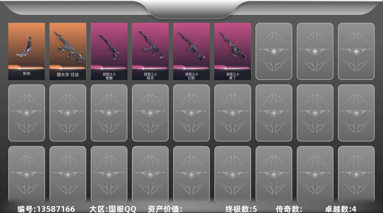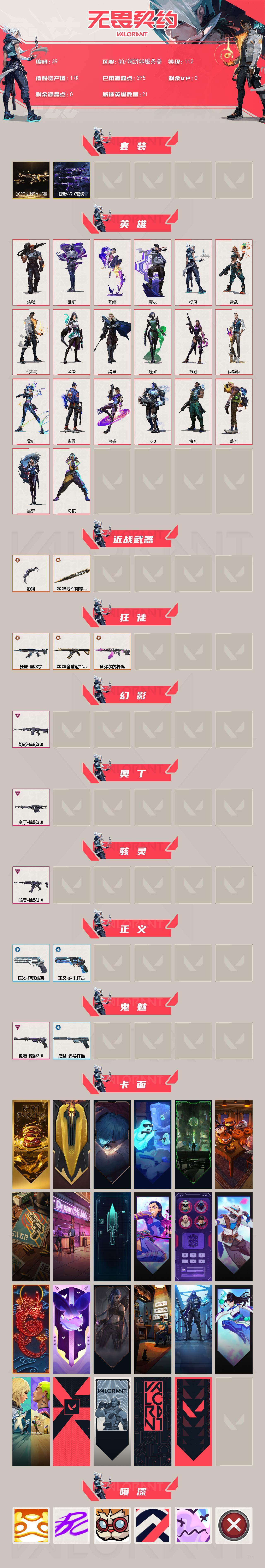 [13587166]【套装】:2025全球冠军赛套装,掠影//2.0套装 【英雄】:幻棱,炼狱,维斯,暮蝶,壹决,捷风,雷兹,不死鸟,贤者,猎枭,蝰蛇,芮娜,尚勃勒,霓虹,夜露,星礈,K/O,海神,盖可,黑梦 【近战 武器】:近战武器-2025全球冠军赛 蝴蝶刀,近战武器-影钩 【狂徒】:狂徒-2025全球冠军赛,狂徒-塑水宗,狂徒-多弥尔的复仇 【幻影】:幻影-掠影//2.0 【奥丁】:奥丁-掠影//2.0 【骇灵】:骇灵-掠影//2.0 【正义】:正义-纳米打击,正义-游戏结束 【鬼魅】:鬼魅-掠影//2.0,鬼魅-光导纤维 【卡面】:终章:激斗汉堡 卡面,进入射程 卡面,《双城之战》拥抱 卡面,精灵大战 卡面,欢迎来到底城 卡面,南瓜盛典 卡面,正义的化身 卡面,梦幻奶茶 卡面,零点嗅探设计图 卡面,无畏契约GO!第一卷:芮娜 卡面,清除名单 卡面,无畏契约GO!第一卷:零 卡面,龍记 卡面,化茧成蝶 卡面,《双城之战》金克丝 卡面,完美调谐 卡面 ,暗枪 卡面,无畏契约GO!第一卷:贤者 卡面,钢锁vs盖可 卡面,代号红色 卡面,新兵报到 卡面,V契约 卡面,无畏契约 卡面 【喷漆】:嗨宝南瓜灯 喷漆,嘭! 喷漆,都算到了 喷漆,控场勿近 喷漆,伤心心 喷漆,买装还是存钱 喷漆,醒狮贺春 喷漆,无畏契约GO!第一卷:芮娜 喷漆,红鳞 喷漆,无畏契约GO!第一卷:零 喷漆,无畏契约GO!第一卷:捷风 喷漆,无畏契约GO!第一卷:贤者 喷漆,暴走萝莉 喷漆,松叶 喷漆,无畏契约GO!第一卷:奇乐 喷漆,旅行小熊 喷漆,蕊形灯 喷漆,胜利属于无畏契约 喷漆,GLHF 喷漆,无畏契约 喷漆 【挂饰】:终章:猫猫木乃伊 挂饰,悠闲鸡块 挂饰,伞绳 挂饰,《双城之战》小蛋糕 挂饰,第九季//第三幕 纪念币 挂饰,鱼骨头 挂饰,第九季//第一幕 纪念币 挂饰,第八季//第二幕 纪念币 挂饰 ,天外飞客 挂饰,好运福爪 挂饰,终章:晒出笑脸 挂饰,红鳞松叶 挂饰,《双城之战》魄罗 挂饰,酷闪轮滑 挂饰,瞄这里 挂饰,第八季//第一幕 纪念币 挂饰,无畏契约 纪念币 挂饰