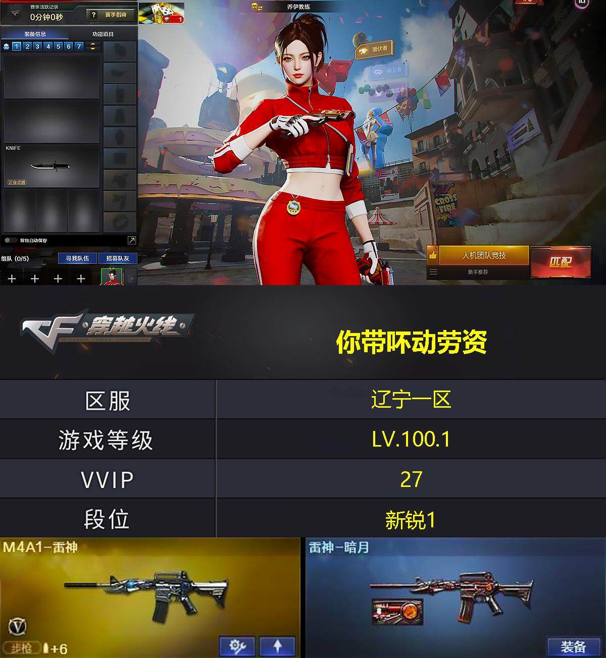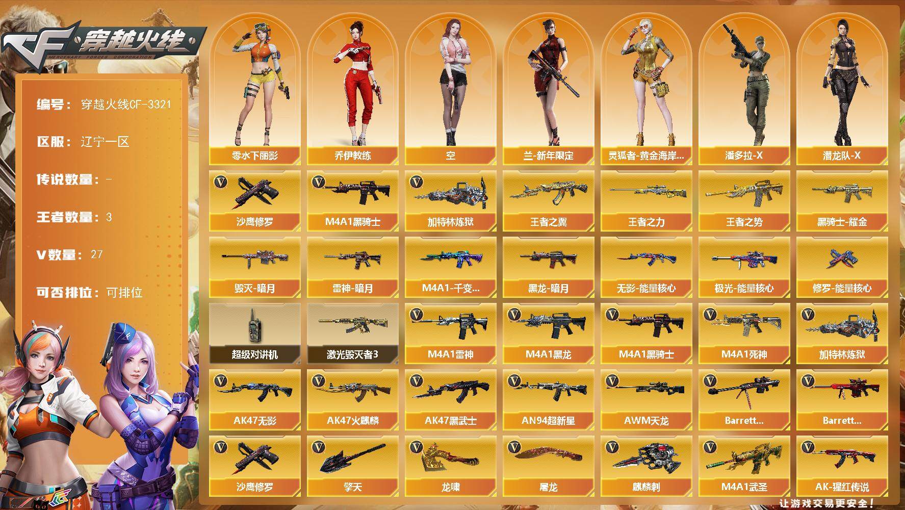 [13588516]辽宁一区-27V-3王者-0炫金 【热门武器】:M4A1-黑骑士,加特林-炼狱,沙鹰-修罗*3 【王者炫金武器】:王者之翼,王者之势,王者之力 【皮肤】:雷神-暗月,毁灭-暗月*2,M4A1-千变-孔明皮肤,黑龙-暗月,黑骑士耀金皮肤,无影-能量核心,极光-能量核心,修罗-能量核心 【角色】:乔伊教练,空,兰-新年限定,零-水下丽影,灵狐者-黄金海岸,潘多拉-X,潜龙队-X,新娜塔莎,影武者-X 【暴走生化】:超级对讲机 【挑战大师】:激光毁灭者III 【英雄级武器】:AK47-火麒麟,M4A1-黑龙*2,M4A1-雷神,M4A1-黑骑士,AK47-无影*2,M4A1-死神,AK47-黑武士,AN94-超新星,M4A1-武圣,AK-47-猩红传说*2,AWM-天龙,Barrett-毁灭,Barrett-极光,加特林-炼狱,沙鹰-修罗*3,屠龙*2,龙啸,擎天*2,麒麟刺 【道具】:云山科技背包,亚洲杯纪念炫彩背包,战舰背包,炫彩背包,超级背包,绿色巨人,灵魂忍者,迷雾幽灵,夺命之镰,防化服*3,枪王排位29赛季金色流光,防弹头盔*2,防弹衣*2,C4工具钳*2,手雷包*2 【特殊枪械】:1黑骑士,1炼狱