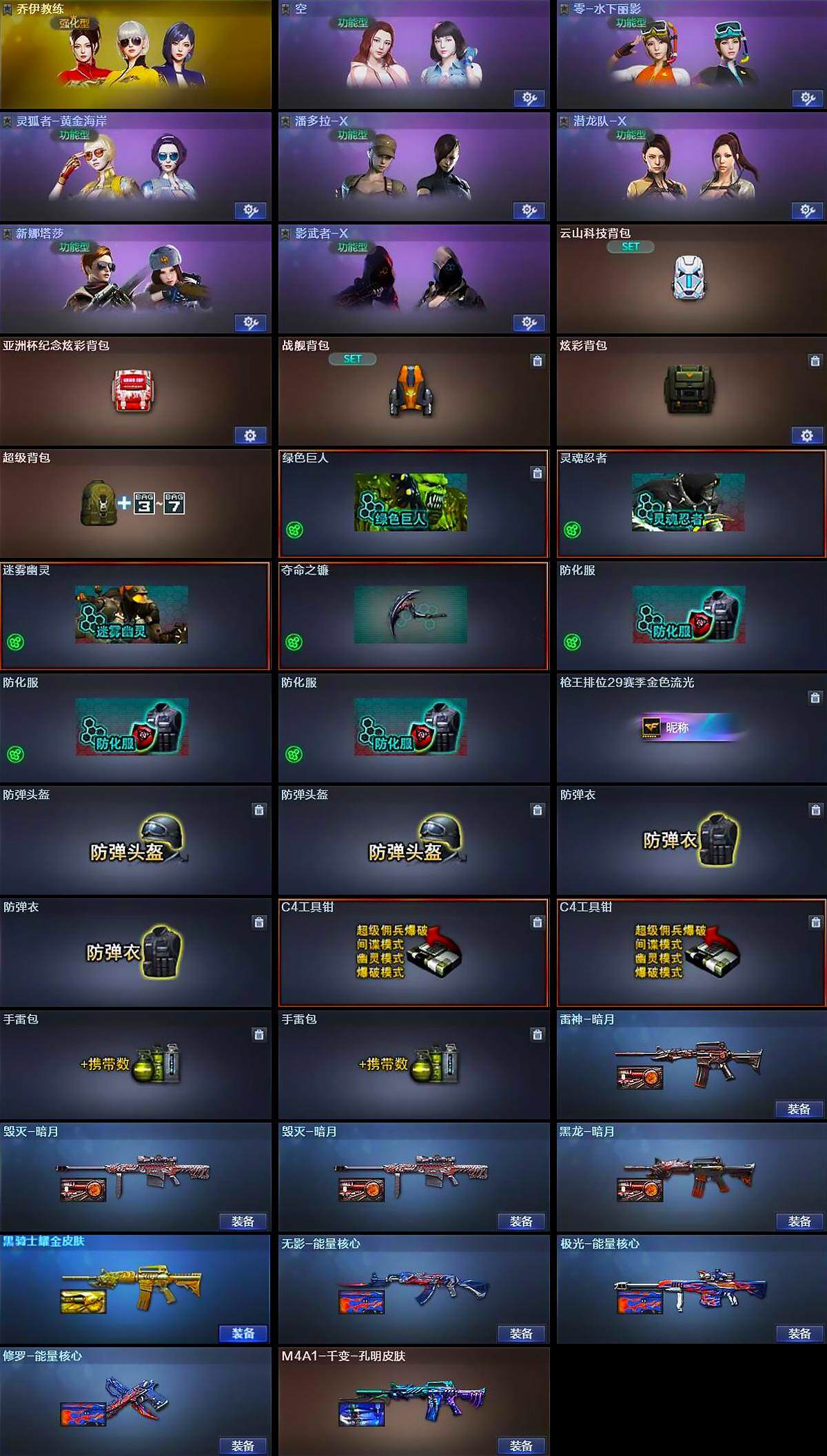 【道具】:云山科技背包,亚洲杯纪念炫彩背包,战舰背包,炫彩背包,超级背包,绿色巨人,灵魂忍者,迷雾幽灵,夺命之镰,防化服*3,枪王排位29赛季金色流光,防弹头盔*2,防弹衣*2,C4工具钳*2,手雷包*2