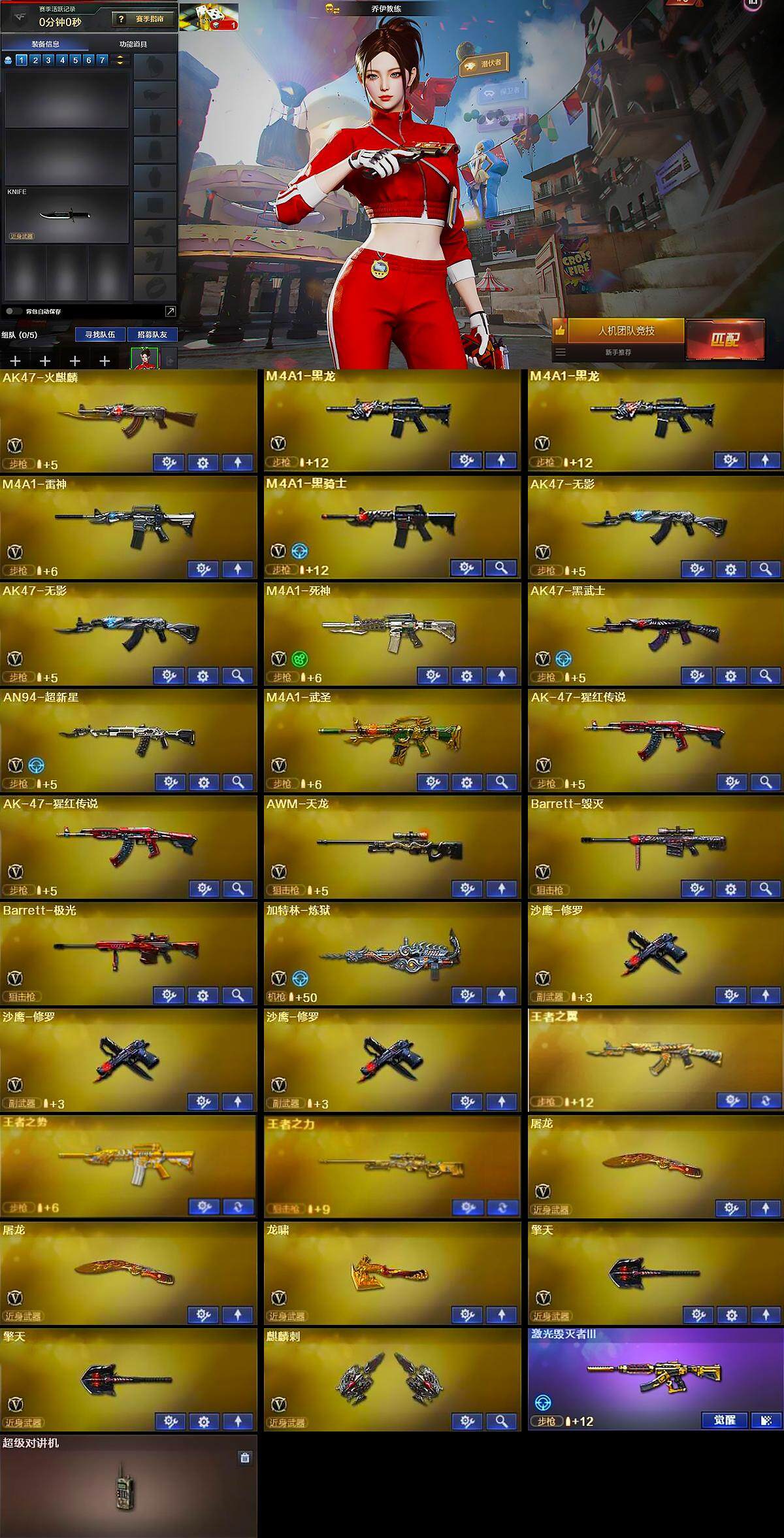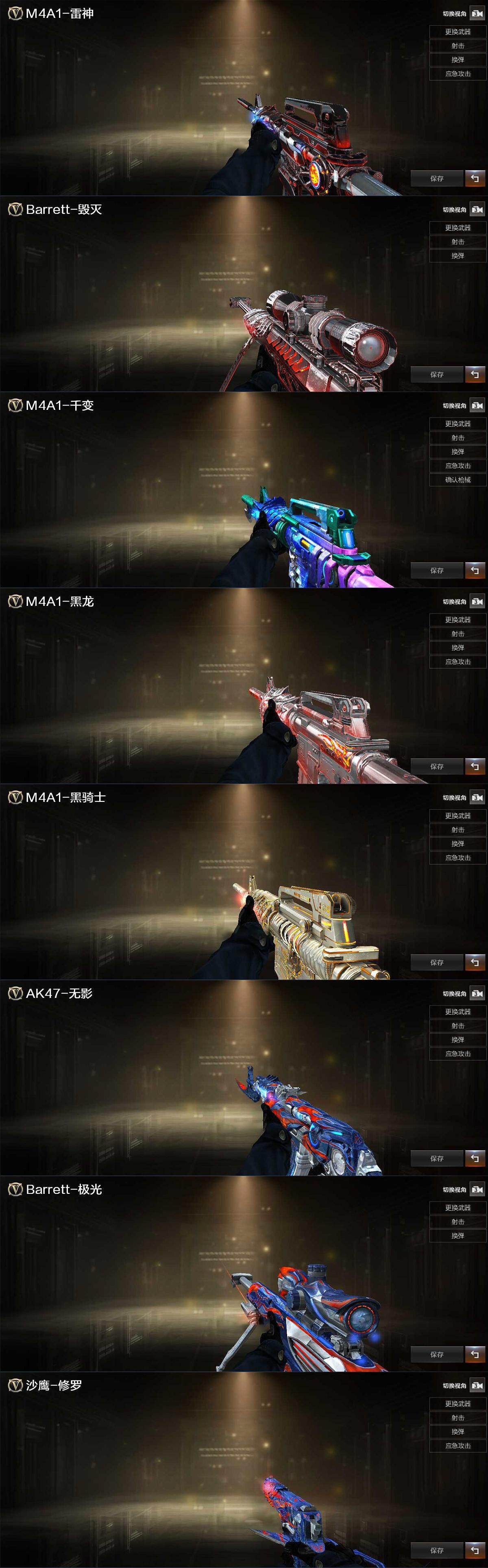 【英雄级武器】:AK47-火麒麟,M4A1-黑龙*2,M4A1-雷神,M4A1-黑骑士,AK47-无影*2,M4A1-死神,AK47-黑武士,AN94-超新星,M4A1-武圣,AK-47-猩红传说*2,AWM-天龙,Barrett-毁灭,Barrett-极光,加特林-炼狱,沙鹰-修罗*3,屠龙*2,龙啸,擎天*2,麒麟刺