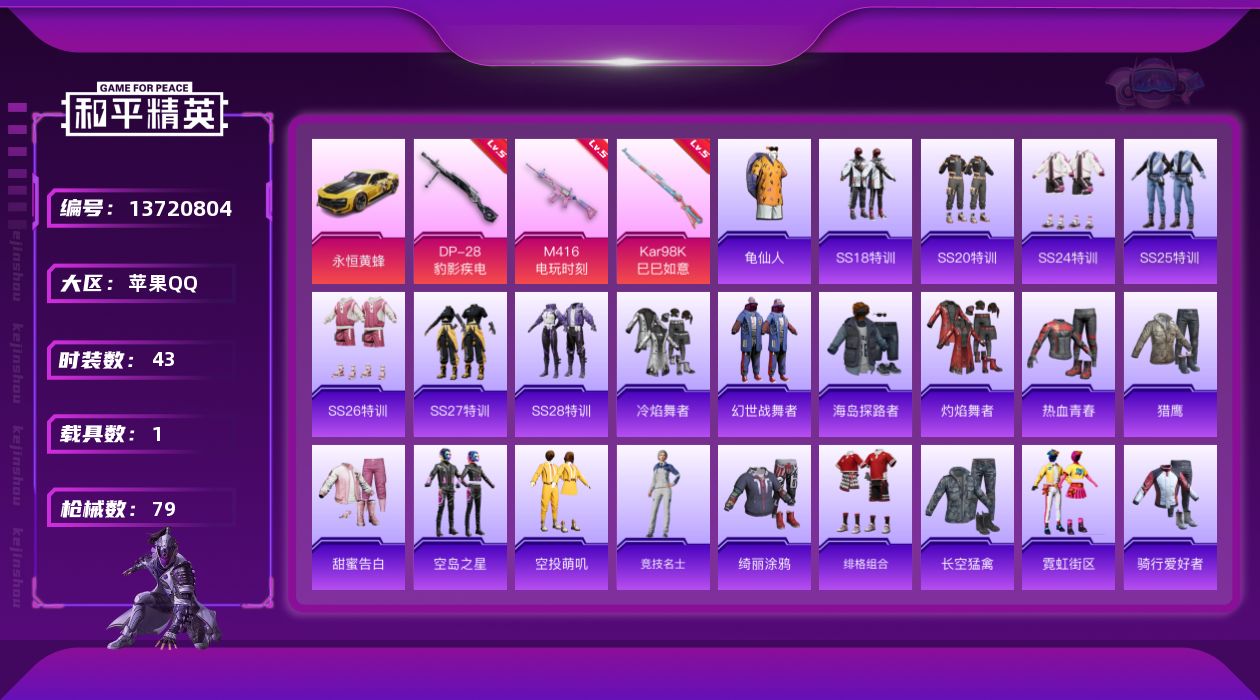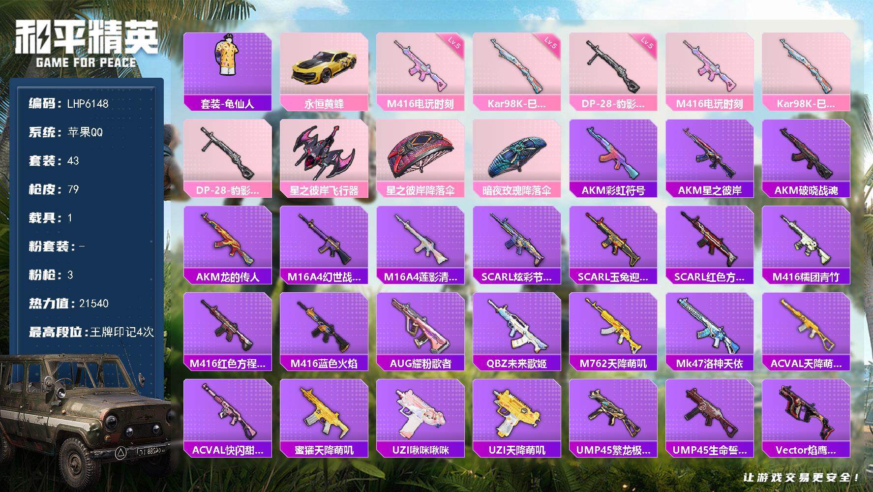 [13720804]可二次【店主推荐捡漏号!可直接换绑】/绝世印记1/地铁满天赋 苹果 手Q-3特效枪-1载具-1粉色飞行器-2.1w热力值-4王牌印记-43套装-79枪皮【热门品类】:套装-龟仙人【粉色载具】:永恒黄蜂【粉色枪皮等级】:M416-电玩时刻(五级),Kar98K-巳巳如意(五级),DP-28-豹影疾电(五级)【粉色飞行器】:星之彼岸飞行器