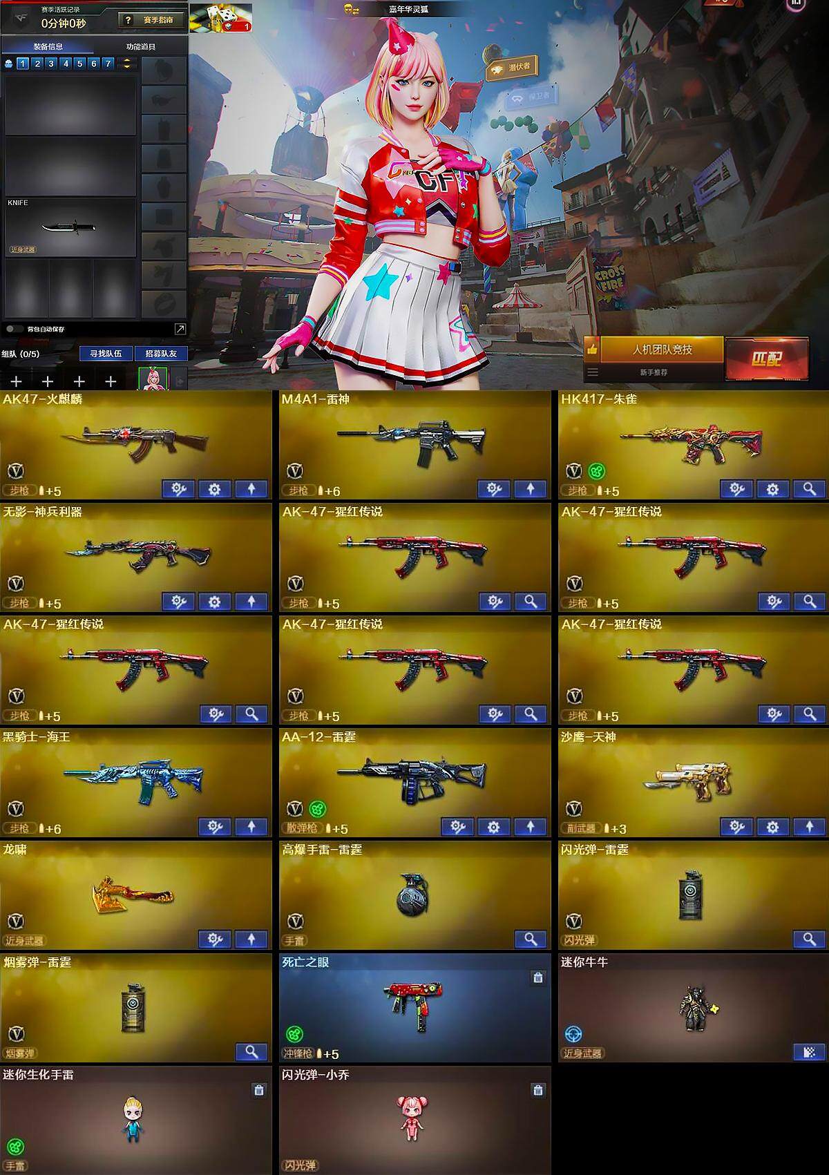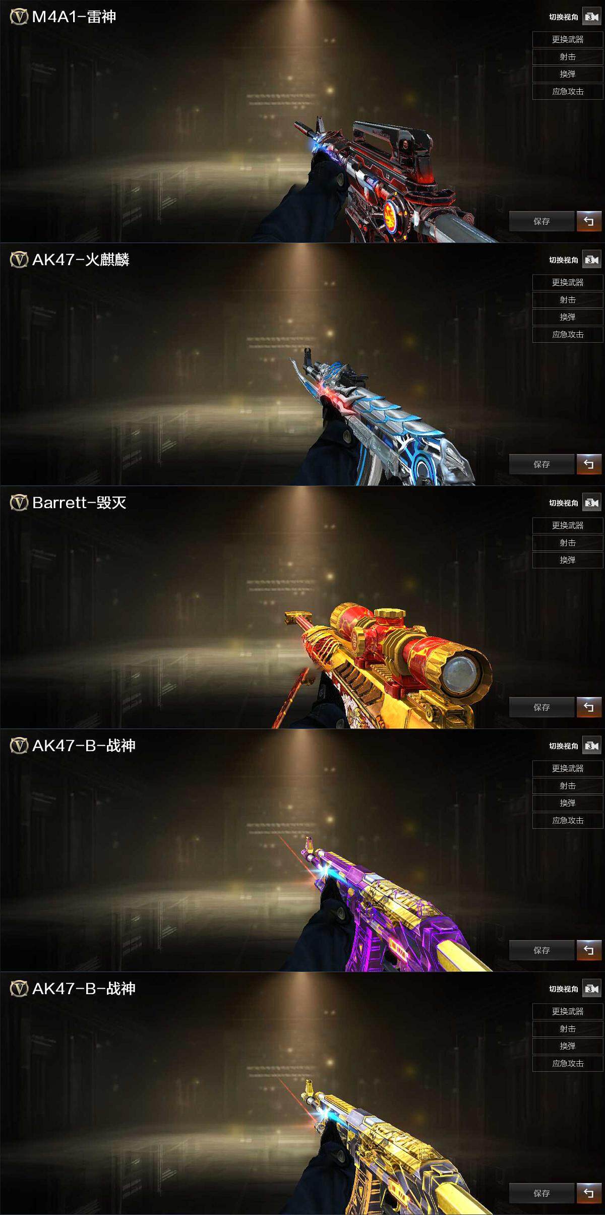 【英雄级武器】:AK47-火麒麟,M4A1-雷神,HK417-朱雀,无影-神兵利器,AK-47-猩红传说*5,AK47-B-战神,黑骑士-海王,Barrett-金色蔷薇,AA-12-雷霆,沙鹰-天神,龙啸,高爆手雷-雷霆,闪光弹-雷霆,烟雾弹-雷霆