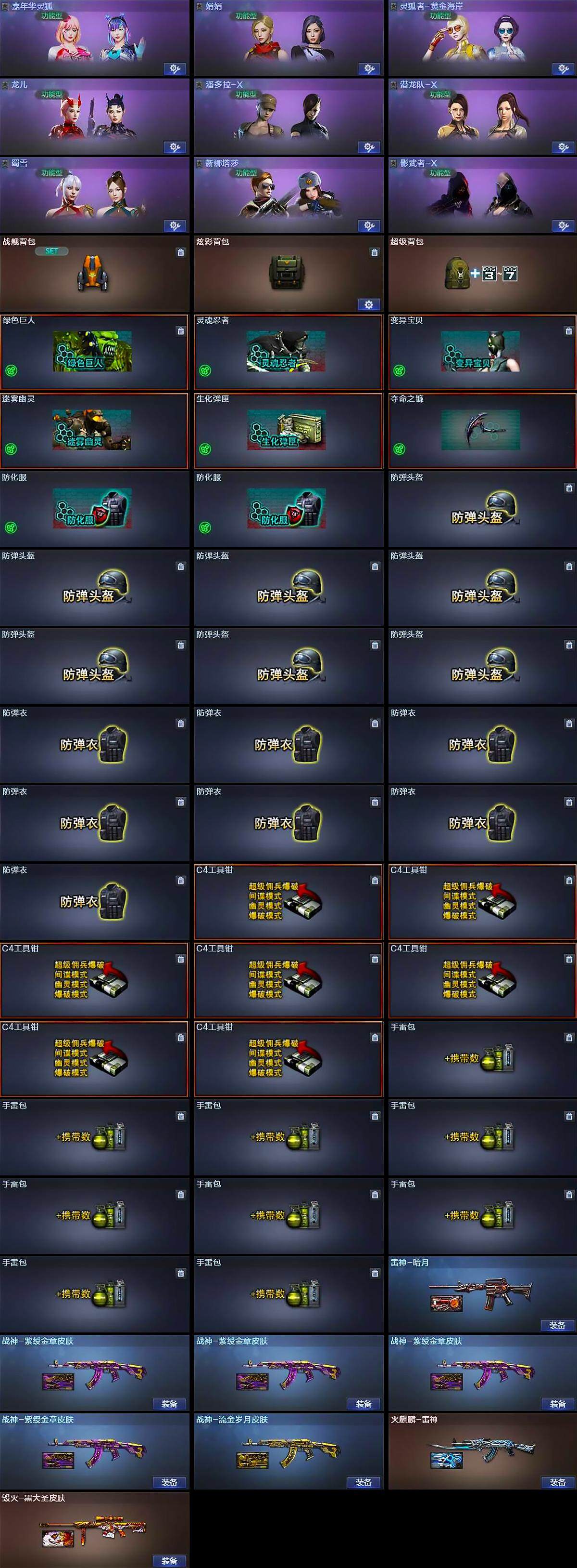 【道具】:战舰背包,炫彩背包,超级背包,绿色巨人,灵魂忍者,变异宝贝,迷雾幽灵,生化弹匣,夺命之镰,防化服*2,防弹头盔*7,防弹衣*7,C4工具钳*7,手雷包*9