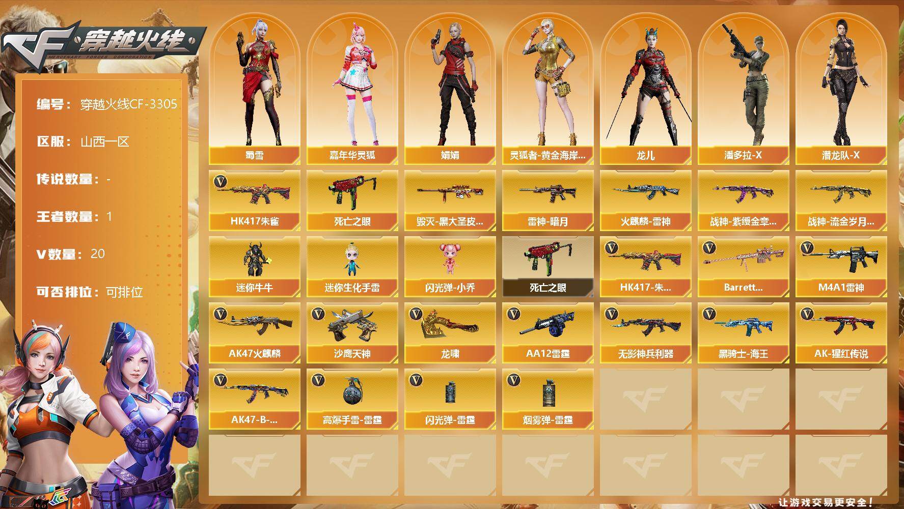 [13631606]山西一区-20V-1王者-0炫金 【热门武器】:HK417-朱雀,死亡之眼 【皮肤】:雷神-暗月,火麒麟-雷神,毁灭-黑大圣皮肤,战神-紫绶金章皮肤*4,战神-流金岁月皮肤 【角色】:嘉年华灵狐,娟娟,0号玩家,灵狐者-黄金海岸,龙儿,潘多拉-X,潜龙队-X,蜀雪,新娜塔莎,影武者-X 【人偶武器】:迷你牛牛,迷你生化手雷,闪光弹-小乔 【暴走生化】:死亡之眼 【英雄级武器】:AK47-火麒麟,M4A1-雷神,HK417-朱雀,无影-神兵利器,AK-47-猩红传说*5,AK47-B-战神,黑骑士-海王,Barrett-金色蔷薇,AA-12-雷霆,沙鹰-天神,龙啸,高爆手雷-雷霆,闪光弹-雷霆,烟雾弹-雷霆 【道具】:战舰背包,炫彩背包,超级背包,绿色巨人,灵魂忍者,变异宝贝,迷雾幽灵,生化弹匣,夺命之镰,防化服*2,防弹头盔*7,防弹衣*7,C4工具钳*7,手雷包*9 【特殊枪械】: