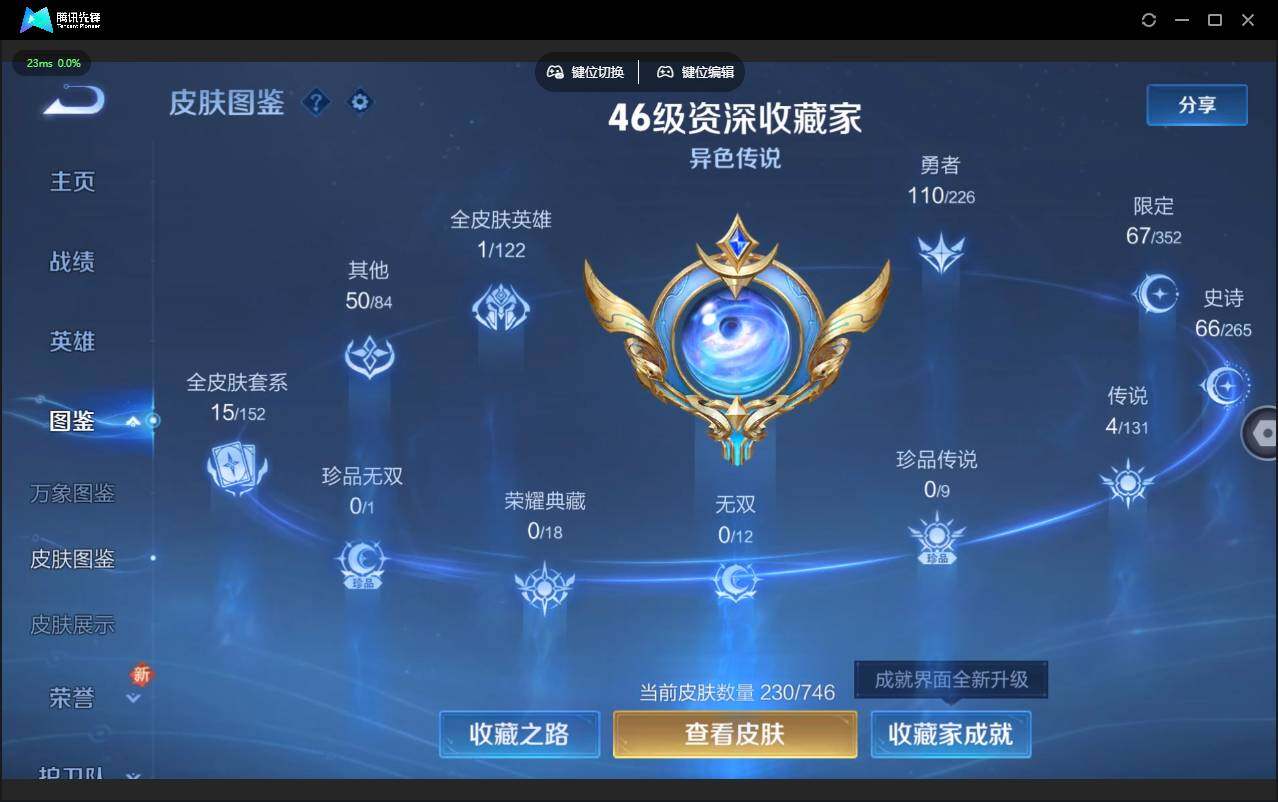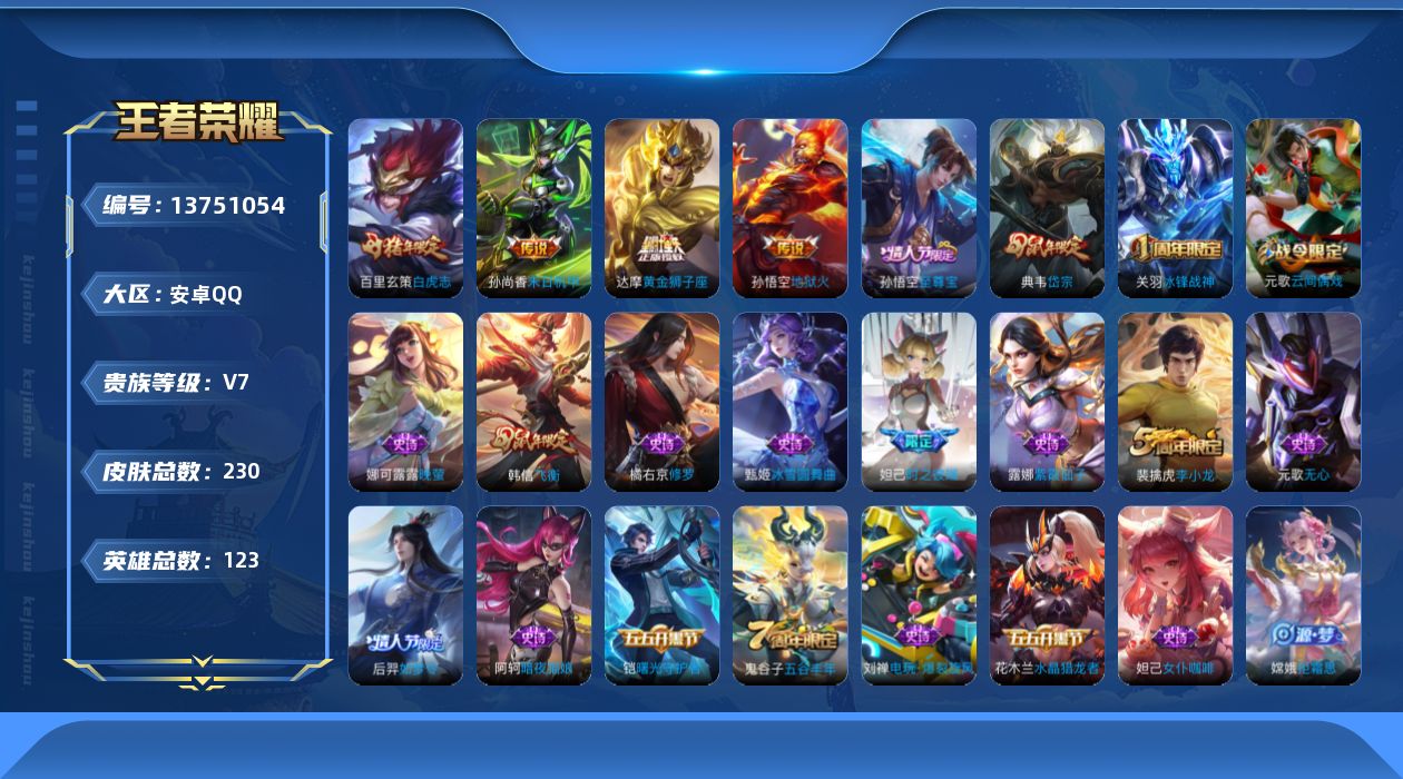 - PX_2040983-贵族等级: V5 英雄数: 90 皮肤数: 63 传说皮: 云鹰飞将,猫影幻舞 限定皮: 李小龙,飞衡,如梦令-后羿