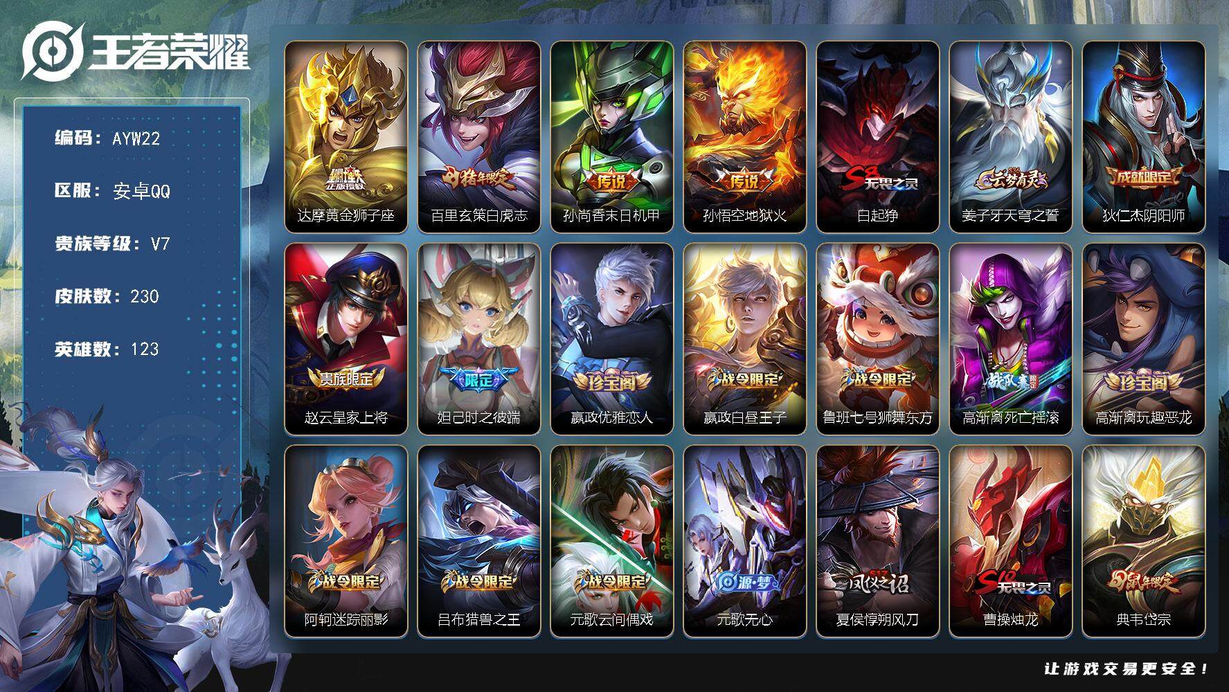 [13751054]可二次【店主推荐捡漏号!可直接换绑】安卓Q-V7-秩序白银I段位-123英雄-230皮肤-4传说-66史诗 【英雄全皮】:蒙恬全皮 【传说皮肤】:达摩黄金狮子座,百里玄策白虎志,孙尚香末日机甲,孙悟空地狱火 【限定皮肤】:白起狰,姜子牙天穹之誓,狄仁杰阴阳师,赵云皇家上将,妲己时之彼端,嬴政优雅恋人,嬴政白昼王子,鲁班七号狮舞东方,高渐离死亡摇滚,高渐离玩趣恶龙,阿轲迷踪丽影,吕布猎兽之王,元歌云间偶戏,元歌无心,夏侯惇朔风刀,曹操烛龙,典韦岱宗,狄仁杰魔术师,狄仁杰万华元夜,达摩沙漠行僧,项羽海滩派对,老夫子醍醐杖,关羽冰锋战神,程咬金演武夺筹,刘邦夺宝奇兵,韩信飞衡,兰陵王金庭之子,亚瑟潮玩骑士王,孙悟空至尊宝,牛魔御旌,后羿如梦令,李元芳银河之约,李元芳云中旅人,钟馗神迹守卫,钟馗驱傩正仪,干将莫邪胡桃夹子,雅典娜单词大作战,雅典娜黎明之约,蔡文姬繁星吟游,太乙真人饕餮,太乙真人华丽摇滚,鬼谷子原初探秘者,鬼谷子五谷丰年,苏烈千军破阵,百里玄策白虎志,百里玄策原初追逐者,弈星混沌棋,梦奇顽趣,沈梦溪星空之诺,沈梦溪大漠名商,明世隐疑决卦,裴擒虎李小龙,裴擒虎擒涛扼浪,米莱狄御霄,云中君纤云弄巧,盾山御銮,上官婉儿梁祝,嫦娥拒霜思,蒙犽狂想玩偶喵,鲁班大师探海日志,桑启海盐诗旅,阿古朵江河有灵,张良古海寻踪,蒙恬荣光圣徽,鬼谷子天穹祈灯,刘邦剑破天穹,周瑜熔金海岸 【年限皮肤】:百里玄策白虎志,韩信飞衡,典韦岱宗 【赛季限定】:白起狰,夏侯惇朔风刀,曹操烛龙,狄仁杰万华元夜,达摩沙漠行僧,老夫子醍醐杖,程咬金演武夺筹,兰陵王金庭之子,张良古海寻踪,牛魔御旌,李元芳云中旅人,钟馗驱傩正仪,雅典娜黎明之约,太乙真人饕餮,鬼谷子原初探秘者,苏烈千军破阵,百里玄策原初追逐者,弈星混沌棋,梦奇顽趣,沈梦溪大漠名商,明世隐疑决卦,裴擒虎擒涛扼浪,米莱狄御霄,盾山御銮,鲁班大师探海日志,桑启海盐诗旅,鬼谷子天穹祈灯,蒙恬荣光圣徽,刘邦剑破天穹,姜子牙天穹之誓 【战令限定】:嬴政白昼王子,鲁班七号狮舞东方,阿轲迷踪丽影,吕布猎兽之王,元歌云间偶戏,刘邦夺宝奇兵,亚瑟潮玩骑士王,李元芳银河之约,钟馗神迹守卫,雅典娜单词大作战,沈梦溪星空之诺,蒙犽狂想玩偶喵 【史诗皮肤】:露娜紫霞仙子,阿轲暗夜猫娘,赵云皇家上将,赵云未来纪元,貂蝉圣诞恋歌,甄姬冰雪圆舞曲,狄仁杰魔术师,廉颇地狱