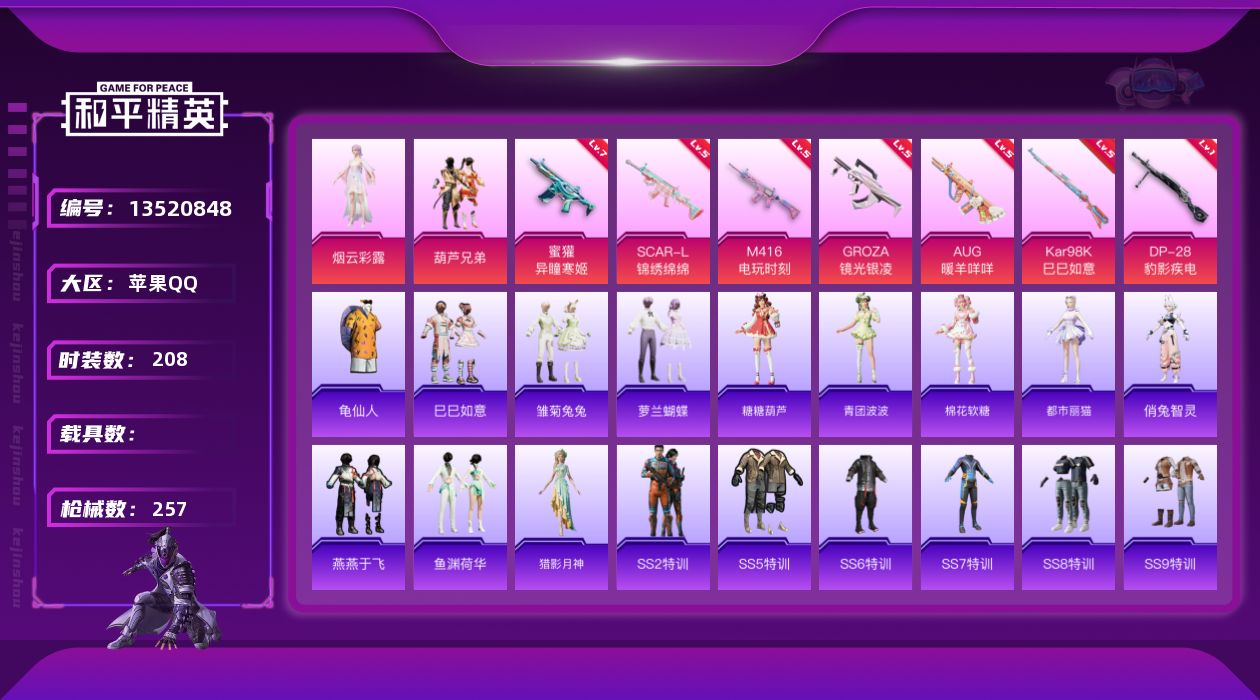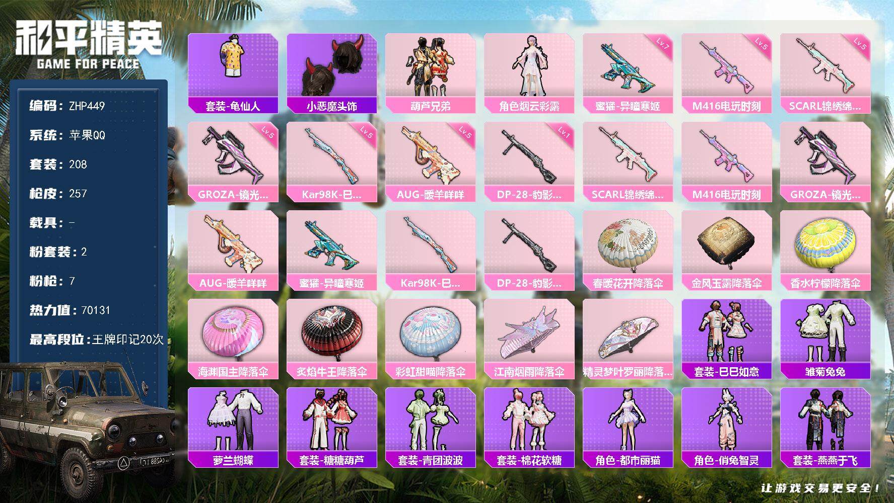 [13520848]可二次【店主推荐捡漏号!可直接换绑】/地铁满天赋 苹果 手Q-2粉装-7特效枪-7w热力值-20王牌印记-208套装-257枪皮【热门品类】:套装-龟仙人,小恶魔头饰【粉色套装】:粉装-葫芦兄弟,角色-烟云彩露【粉色枪皮等级】:SCAR-L-锦绣绵绵(五级),M416-电玩时刻(五级),GROZA-镜光银凌(五级),AUG-暖羊咩咩(五级),蜜獾-异瞳寒姬(七级),Kar98K-巳巳如意(五级),DP-28-豹影疾电(一级)