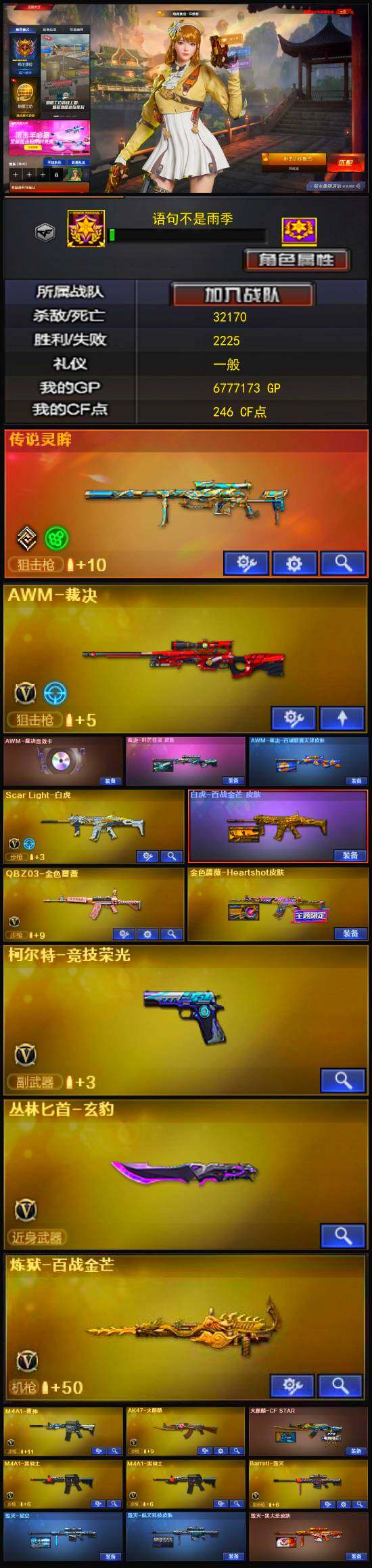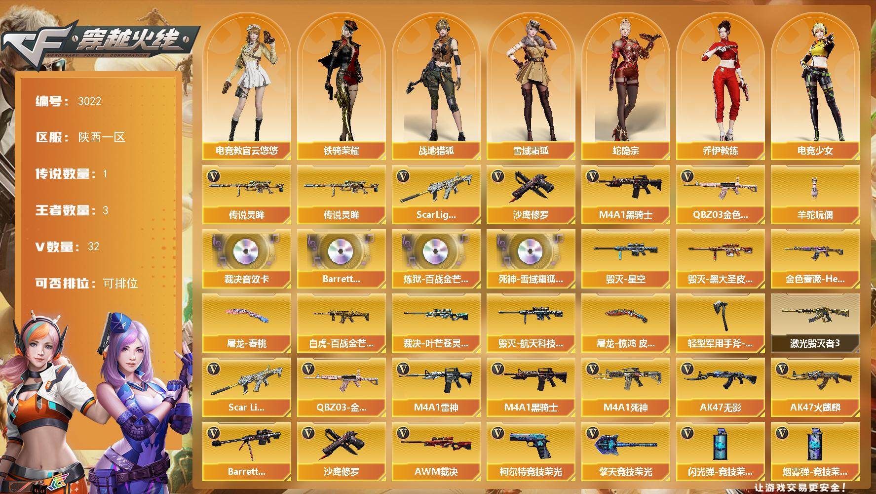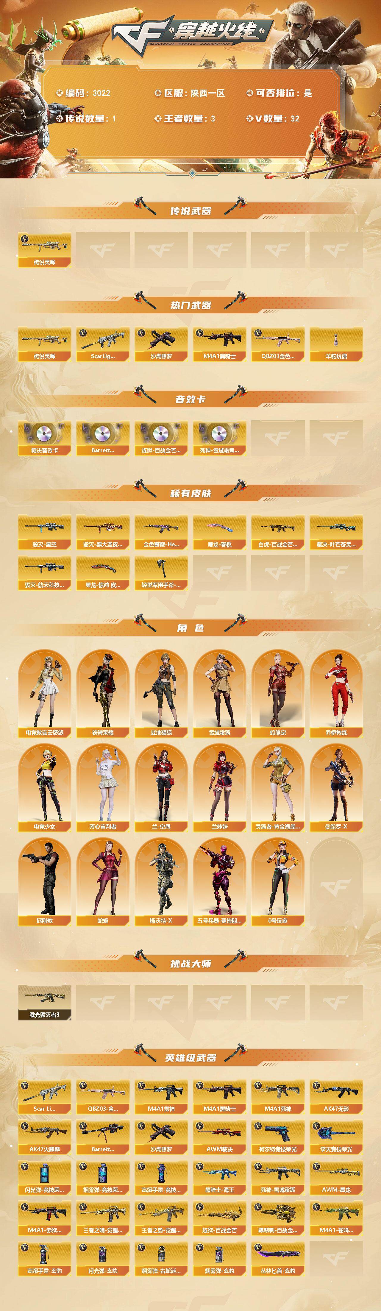 [13522258]陕西一区-32V-3王者-0炫金 【传说武器】:传说灵眸 【热门武器】:传说灵眸,QBZ03-金色蔷薇,Scar Light-白虎,M4A1-黑骑士*2,羊驼玩偶,沙鹰-修罗 【音效卡】:AWM-裁决音效卡,Barrett-碧霄极光音效卡,炼狱-百战金芒-庆典舞曲音效卡,死神-雪域霜狐-怀旧音效卡 【皮肤】:白虎-百战金芒 皮肤,金色蔷薇-Heartshot皮肤,裁决-叶芒苍灵 皮肤,毁灭-星空,毁灭-黑大圣皮肤,毁灭-航天科技皮肤,屠龙-春桃 皮肤,屠龙-惊鸿 皮肤,轻型军用手斧-再燃火线 【角色】:电竞教官-云悠悠,战地猎狐,雪域霜狐,蛇隐宗,乔伊教练,电竞少女,芳心审判者,兰-空鹰,兰妹妹,0号玩家,灵狐者-黄金海岸,曼陀罗-X,邱刚敖,蛇姬,斯沃特-X,铁骑荣耀,五号兵器-赛博朋克 【挑战大师】:激光毁灭者III 【英雄级武器】:AK47-火麒麟,M4A1-雷神,M4A1-黑骑士*2,AK47-无影,M4A1-死神,Scar Light-白虎,死神-雪域霜狐,QBZ03-金色蔷薇,王者之魄-觉醒版,王者之势-觉醒版,黑骑士-海王,Barrett-毁灭,AWM-裁决,炼狱-百战金芒,沙鹰-修罗,柯尔特-竞技荣光,擎天-竞技荣光,麒麟刺-百战金芒,丛林匕首-玄豹,高爆手雷-竞技荣光*2,高爆手雷-玄豹,闪光弹-竞技荣光,闪光弹-玄豹,烟雾弹-竞技荣光,烟雾弹-古蛇迷踪,烟雾弹-玄豹*2,M4A1-赤狱骑士,M4A1-苍鸣雷神,AWM-昌龙 【道具】:BS战队炫彩背包,CFS限定背包,云山科技背包,炫彩背包,百战金芒炫彩背包,雪域霜狐炫彩背包,女皇终结者-魔龙之吻,救世主-黑桃战神,绿色巨人,灵魂忍者,迷雾幽灵,夺命之镰,防化服*3,金色流光-枪王排位*2,星辰流光-枪王排位,流光-鎏金之域,流光-再燃火线,语音特效-盛典烟火,语音特效-怀旧,语音特效-机器人,雪域霜狐表情,萌萌小葵表情,炽雪表情,CFPL选手表情-第1套,EP战队名片,EP战队喷图,EP战队击杀图标,C4-黑曜,防弹头盔*4,防弹衣*4,C4工具钳*5,手雷包*5 【特殊枪械】:1白虎,2黑骑士