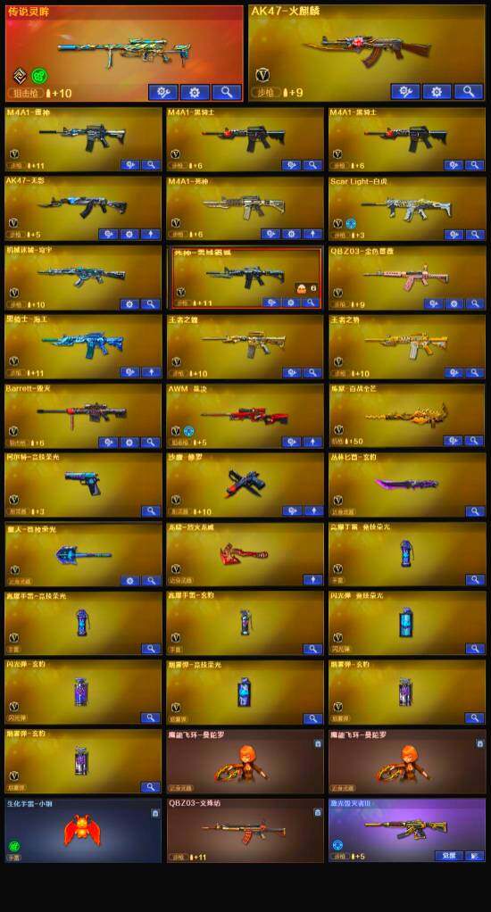 【英雄级武器】:AK47-火麒麟,M4A1-雷神,M4A1-黑骑士*2,AK47-无影,M4A1-死神,Scar Light-白虎,死神-雪域霜狐,QBZ03-金色蔷薇,王者之魄-觉醒版,王者之势-觉醒版,黑骑士-海王,Barrett-毁灭,AWM-裁决,炼狱-百战金芒,沙鹰-修罗,柯尔特-竞技荣光,擎天-竞技荣光,麒麟刺-百战金芒,丛林匕首-玄豹,高爆手雷-竞技荣光*2,高爆手雷-玄豹,闪光弹-竞技荣光,闪光弹-玄豹,烟雾弹-竞技荣光,烟雾弹-古蛇迷踪,烟雾弹-玄豹*2,M4A1-赤狱骑士,M4A1-苍鸣雷神,AWM-昌龙
