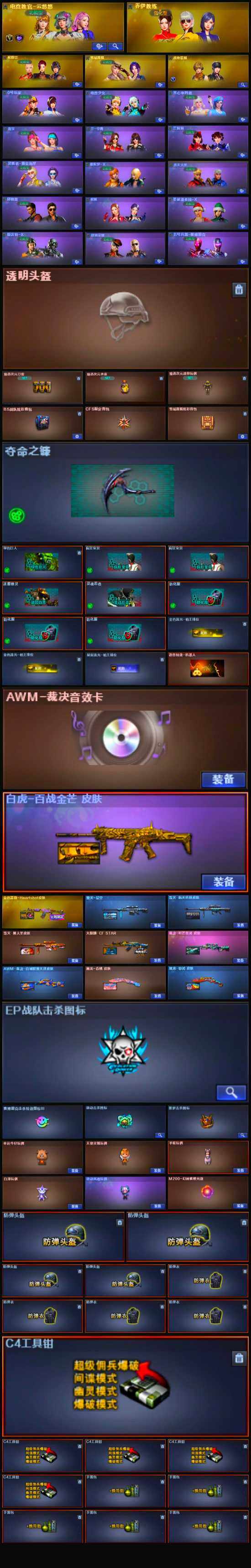 【道具】:BS战队炫彩背包,CFS限定背包,云山科技背包,炫彩背包,百战金芒炫彩背包,雪域霜狐炫彩背包,女皇终结者-魔龙之吻,救世主-黑桃战神,绿色巨人,灵魂忍者,迷雾幽灵,夺命之镰,防化服*3,金色流光-枪王排位*2,星辰流光-枪王排位,流光-鎏金之域,流光-再燃火线,语音特效-盛典烟火,语音特效-怀旧,语音特效-机器人,雪域霜狐表情,萌萌小葵表情,炽雪表情,CFPL选手表情-第1套,EP战队名片,EP战队喷图,EP战队击杀图标,C4-黑曜,防弹头盔*4,防弹衣*4,C4工具钳*5,手雷包*5