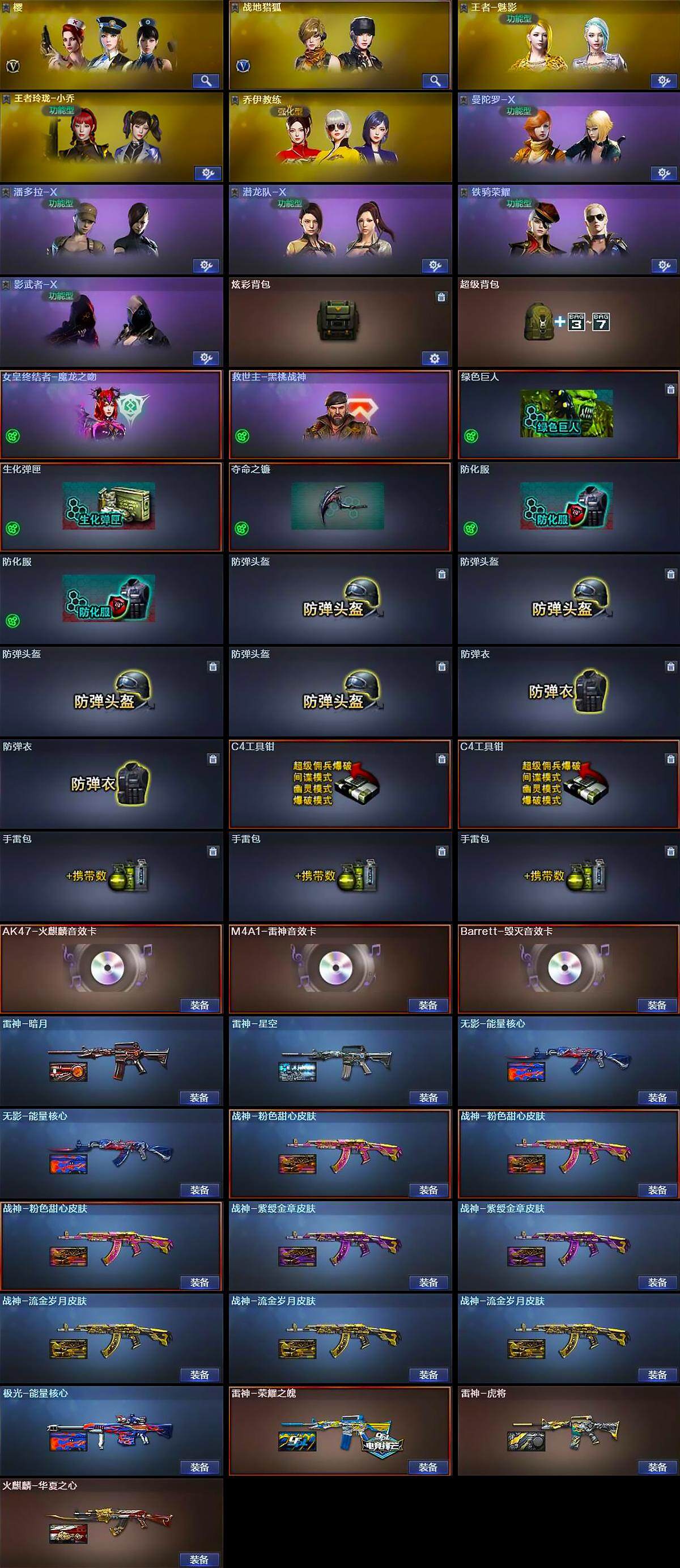 【道具】:炫彩背包,超级背包,女皇终结者-魔龙之吻,救世主-黑桃战神,绿色巨人,生化弹匣,夺命之镰,防化服*2,防弹头盔*4,防弹衣*2,C4工具钳*2,手雷包*3