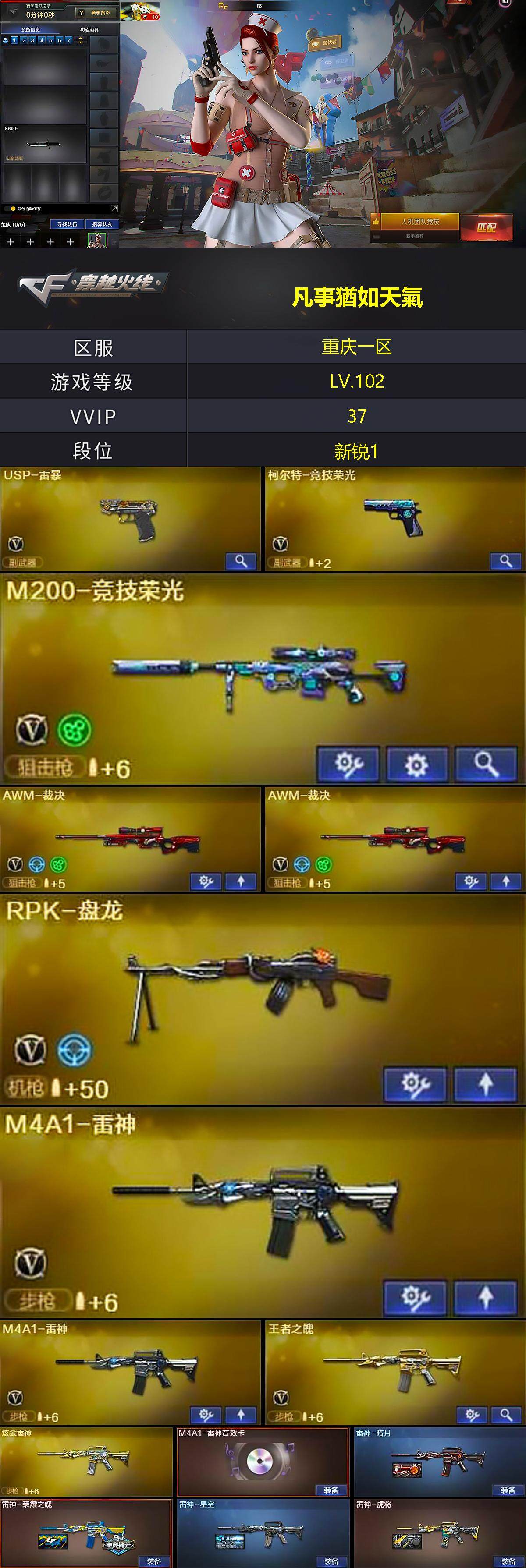 [13655516]重庆一区-37V-6王者-3炫金 【热门武器】:HK417-朱雀,M200-竞技荣光,M4A1-黑骑士*2,RPK-盘龙,加特林-炼狱,USP-雷暴,沙鹰-修罗 【王者炫金武器】:炫金骑士,炫金雷神,炫金修罗 【音效卡】:AK47-火麒麟音效卡,M4A1-雷神音效卡,Barrett-毁灭音效卡 【皮肤】:雷神-暗月,雷神-荣耀之魄,雷神-星空,雷神-虎将,火麒麟-华夏之心,无影-能量核心*2,战神-粉色甜心皮肤*3,战神-紫绶金章皮肤*2,战神-流金岁月皮肤*3,极光-能量核心 【角色】:樱,战地猎狐,王者-魅影,王者玲珑-小乔,乔伊教练,曼陀罗-X,潘多拉-X,潜龙队-X,铁骑荣耀,影武者-X 【人偶武器】:M37-葵,生化手雷-机甲核心,闪光弹-小乔 【英雄级武器】:AK47-火麒麟*2,M4A1-雷神*2,M4A1-黑骑士*2,AK47-黑武士*3,HK417-朱雀,M4A1-玫瑰精灵,王者之魄-觉醒版,王者之戮-觉醒版,超新星-悦享-觉醒版,AK-47-猩红传说*5,AK47-B-战神,Barrett-毁灭,AWM-裁决*2,M200-竞技荣光,RPK-盘龙,加特林-炼狱,沙鹰-修罗,USP-雷暴,柯尔特-竞技荣光,王者之锋-觉醒版,高爆手雷-竞技荣光*4,闪光弹-竞技荣光,烟雾弹-竞技荣光,M4A1-赤狱骑士 【道具】:炫彩背包,超级背包,女皇终结者-魔龙之吻,救世主-黑桃战神,绿色巨人,生化弹匣,夺命之镰,防化服*2,防弹头盔*4,防弹衣*2,C4工具钳*2,手雷包*3 【特殊枪械】:2黑骑士,1盘龙,1炼狱