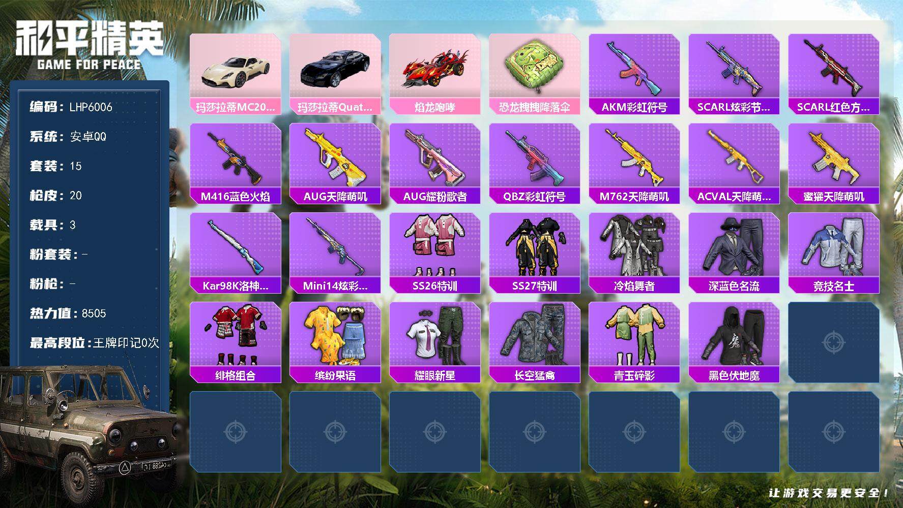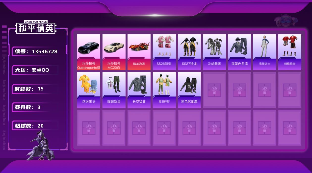 [13536728]可二次【店主推荐捡漏号!可直接换绑】 安卓 手Q-3载具-8505热力值-2王牌印记-15套装-20枪皮【粉色载具】:玛莎拉蒂MC20(星石白),玛莎拉蒂Quattroporte(夜幕蓝),焰龙咆哮