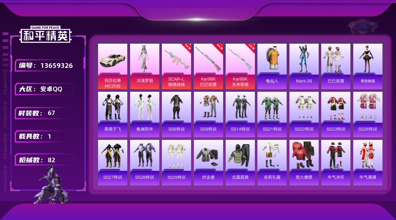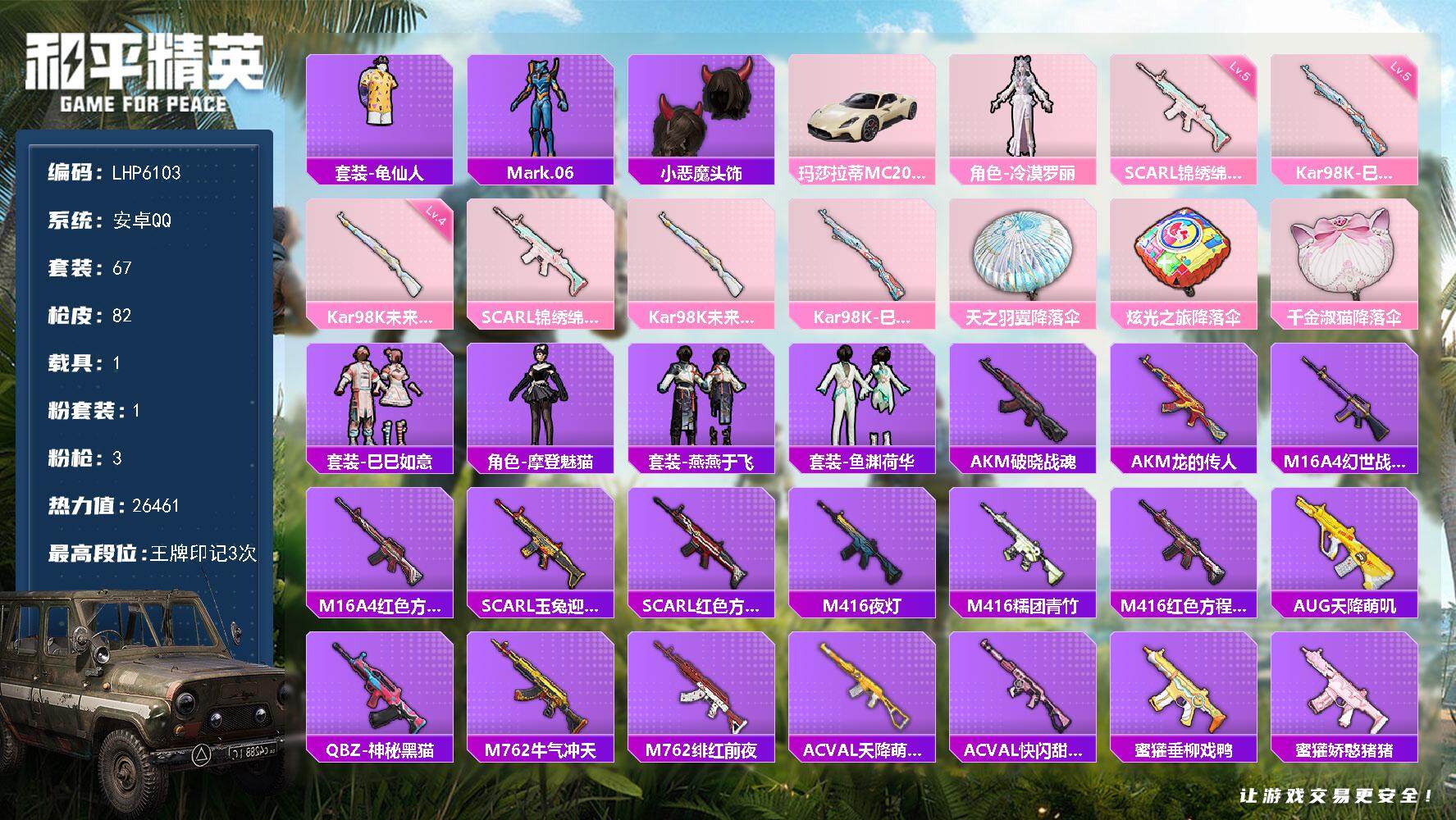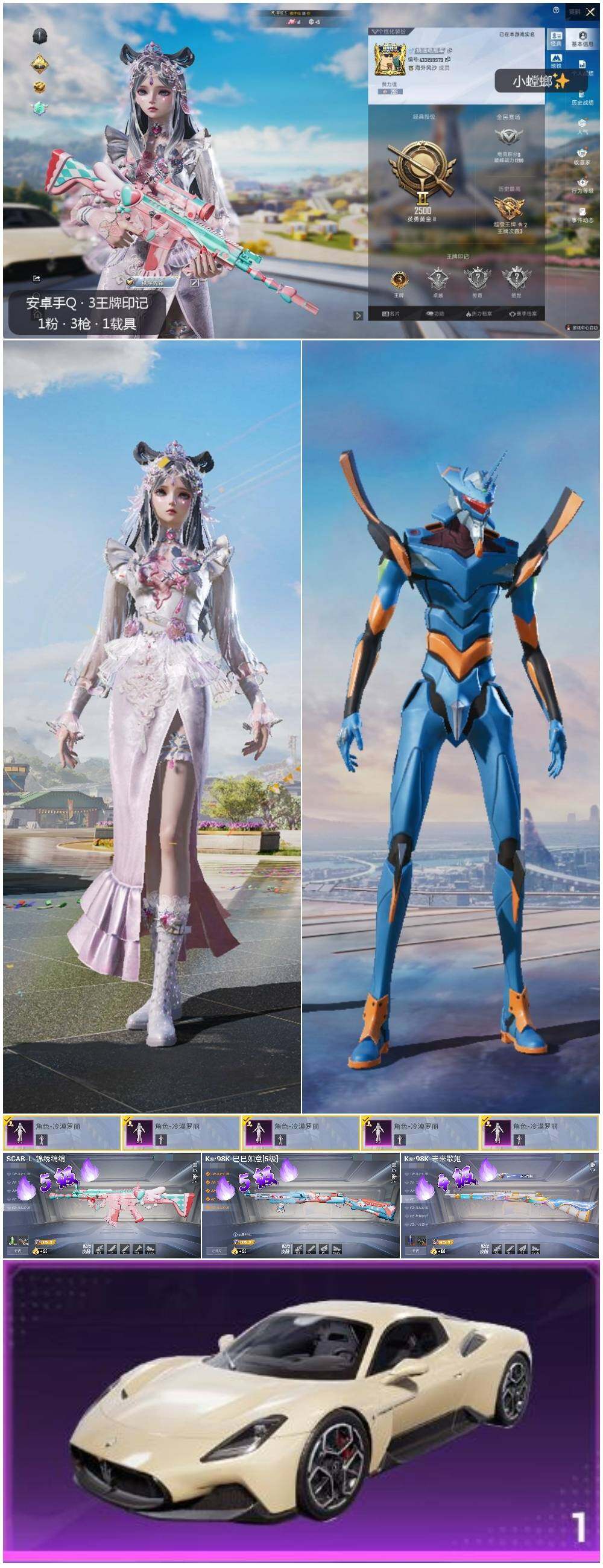 [13659326]【店主推荐捡漏号!可直接换绑】/地铁满天赋 安卓 手Q-1粉装-3特效枪-1载具-0粉色飞行器-26461热力值-3王牌印记-67套装-82枪皮【热门品类】:套装-龟仙人,角色-Mark.06,小恶魔头饰【粉色载具】:玛莎拉蒂MC20(星石白)【粉色套装】:角色-冷漠罗丽【粉色枪皮等级】:SCAR-L-锦绣绵绵(五级),Kar98K-未来歌姬(四级),Kar98K-巳巳如意(五级)