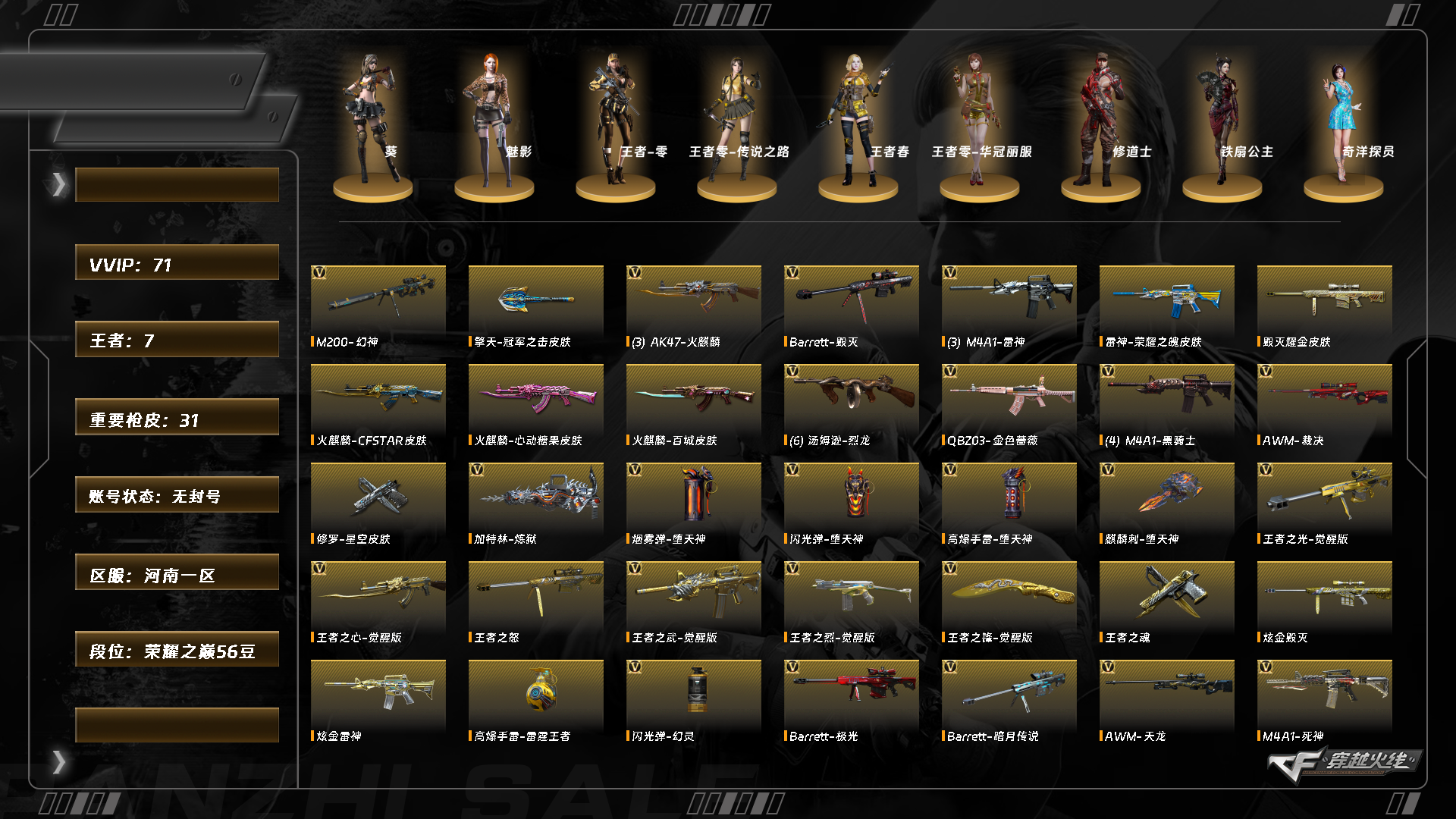[13199617]穿越火线(CF)-北部战区-河南一区 【荣耀之巅56豆】【Lv.102 荣耀元帅】VIP6 71V,7王者,2炫金,毁灭百城浙江 /毁灭耀金/毁灭墨兰/毁灭黑大圣/极光能量核心/天龙能量核心/火麒麟CFSTAR/火麒麟心动糖果/火麒麟百城/无影暗月/_葵/魅影/M200-幻神/Barrett-毁灭/Barrett-极光/Barrett-暗月传说/王者之光-觉醒版/M4A1-黑骑士音效卡/Barrett-毁灭音效卡 【重要角色】_葵/魅影/王者-零/王者零-传说之路/王者春/王者零-华冠丽服/修道士/铁扇公主/奇洋探员/乔伊教练/云海玲珑/铁骑荣耀/零-水下丽影 【传说武器】 【英雄武器】_M200-幻神/Barrett-毁灭/Barrett-极光/Barrett-暗月传说/王者之光-觉醒版/AWM-天龙/AWM-裁决/M4A1-雷神(3)/M4A1-死神/M4A1-黑龙(2)/M4A1-黑骑士(4)/王者之武-觉醒版/AK12-天启/AK47-火麒麟(3)/无影-神兵利器/AK47-黑武士/AK-47-猩红传说/AK47-B-身先士卒/AK47-B-常胜将军/AK47-B-战士(2)/AK47-B-战神/QBZ03-金色蔷薇/王者之心-觉醒版/烈火-动感闪耀/王者之烈-觉醒版/汤姆逊-烈龙(6)/加特林-炼狱/天神-动感闪耀/沙鹰-天神/沙鹰-修罗(5)/麒麟刺/麒麟刺-堕天神/龙啸/擎天/屠龙-动感闪耀/屠龙(2)/幻灵之锋/王者之锋-觉醒版/手雷-动感闪耀/高爆手雷-云龙/高爆手雷-神工天巧/高爆手雷-堕天神/烟雾弹-堕天神/闪光弹-云龙/闪光弹-幻灵/闪光弹-堕天神/机械迷城-穹宇/黑武士-锦绣游龙/魂·QBZ03-金色蔷薇-古蛇迷踪/龙啸-烈火龙威 【王者武器】王者之怒/王者之魂/高爆手雷-雷霆王者 【小人枪】C.A.T/天龙-乔伊教练/AWM-灵狐-15周年嘉年华/炼狱-迷你小钢/COP-青花瓷-斯沃特精英/夺魂(3)/迷你火种(4)/迷你深渊冰龙/迷你曼提柯尔/迷你白狐(4)/迷你裂空之翼(4)/迷你波特博士(2)/Mini沃特X(2)/魔能飞环-曼陀罗/小飞碟-宇航兔兔 【其他重要武器】炫金雷神/炫金毁灭/集束激光-超越MAX/M4A1-仙界-黑骑士/M4A1-英雄-能量核心/火麒麟-暗月/黑武士-能量核心/火麒麟-能量核心/激光毁灭者III-白马银枪(2)