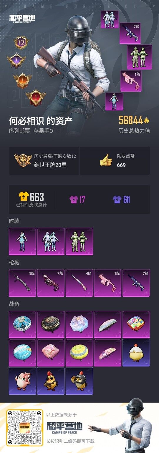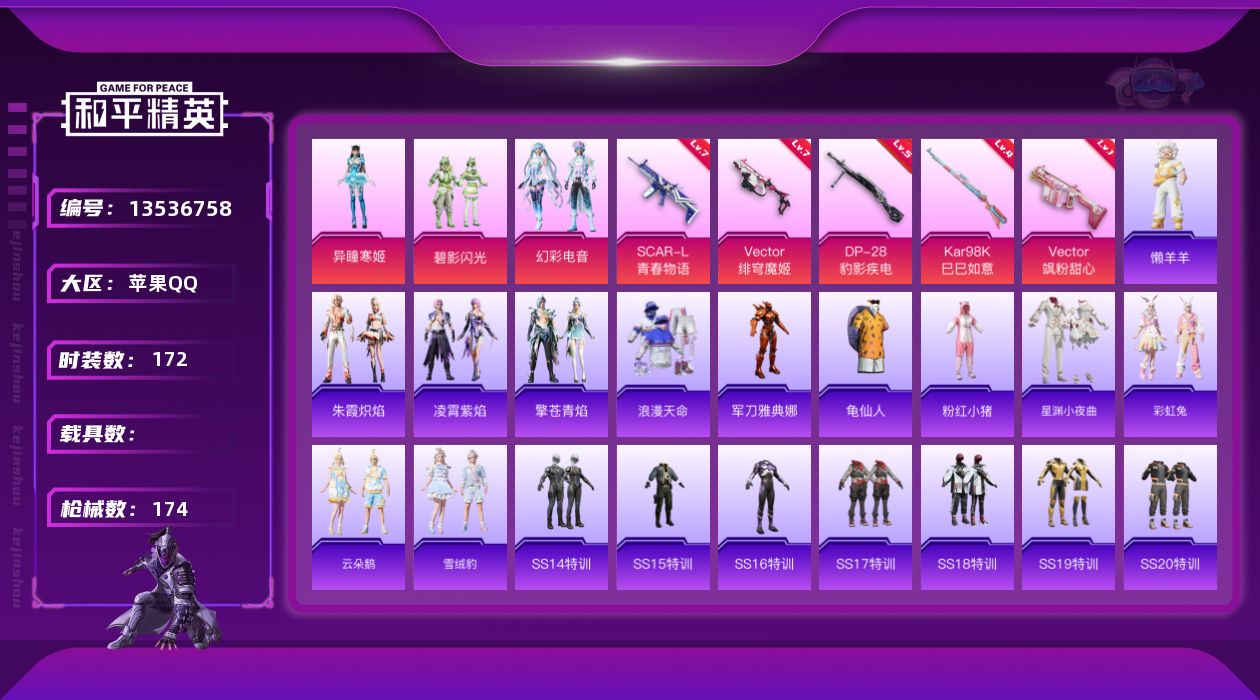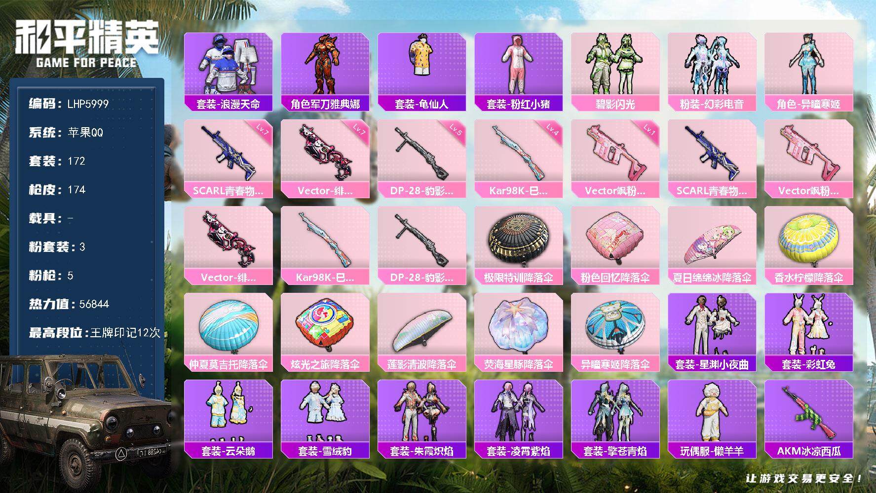 [13536758]不可二次【店主推荐捡漏号!可直接换绑】/绝世印记1 苹果 手Q-3粉装-5特效枪-5.6w热力值-12王牌印记-172套装-174枪皮【热门品类】:套装-浪漫天命,角色-军刀雅典娜,套装-龟仙人,套装-粉红小猪【粉色套装】:粉装-碧影闪光,粉装-幻彩电音,角色-异瞳寒姬【粉色枪皮等级】:SCAR-L-青春物语(七级),Vector-飒粉甜心(一级),Vector-绯穹魔姬(七级),Kar98K-巳巳如意(四级),DP-28-豹影疾电(五级)