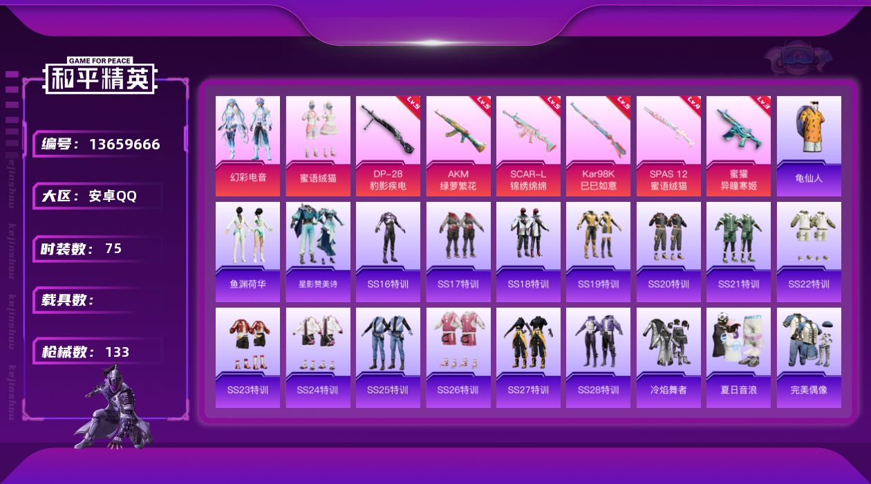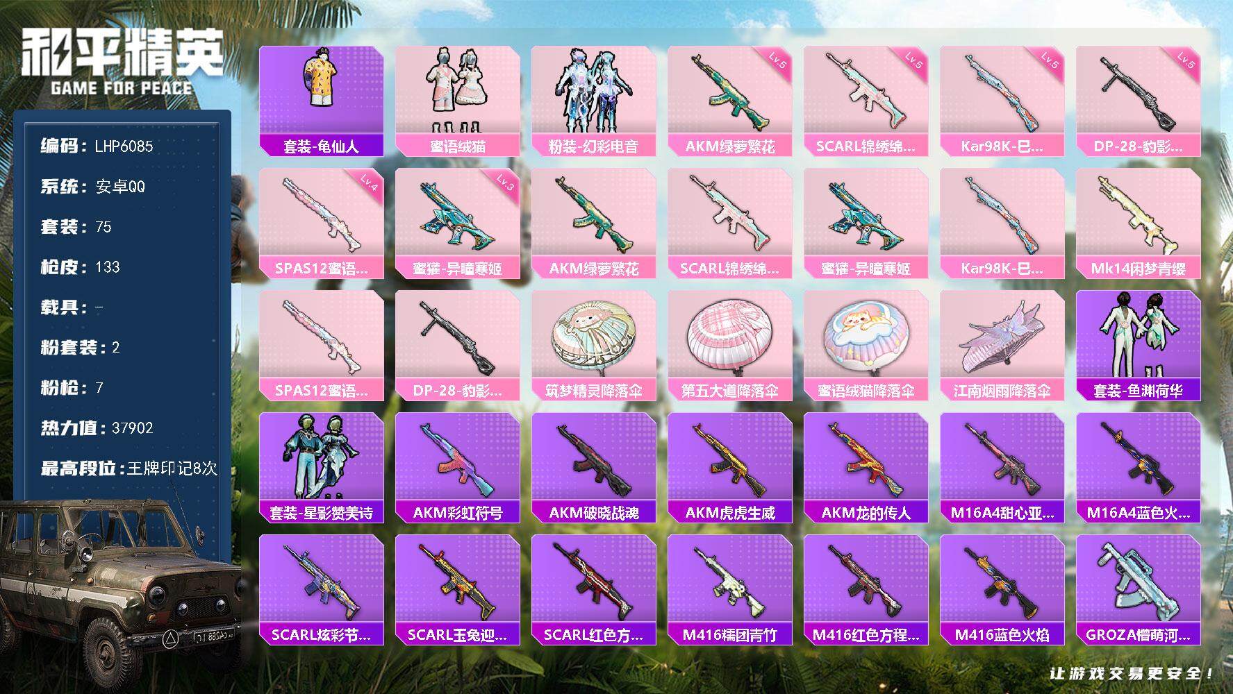 [13659666]【店主推荐捡漏号!可直接换绑】 安卓 手Q-2粉装-7特效枪-3.7w热力值-8王牌印记-75套装-133枪皮【热门品类】:套装-龟仙人【粉色套装】:粉装-蜜语绒猫,粉装-幻彩电音【粉色枪皮等级】:AKM-绿萝繁花(五级),SCAR-L-锦绣绵绵(五级),蜜獾-异瞳寒姬(三级),Kar98K-巳巳如意(五级),SPAS-12-蜜语绒猫(四级),DP-28-豹影疾电(五级)