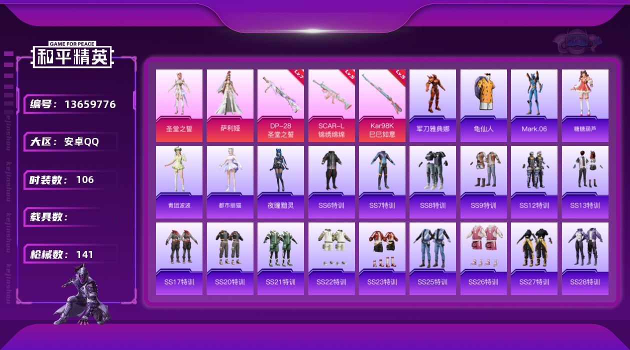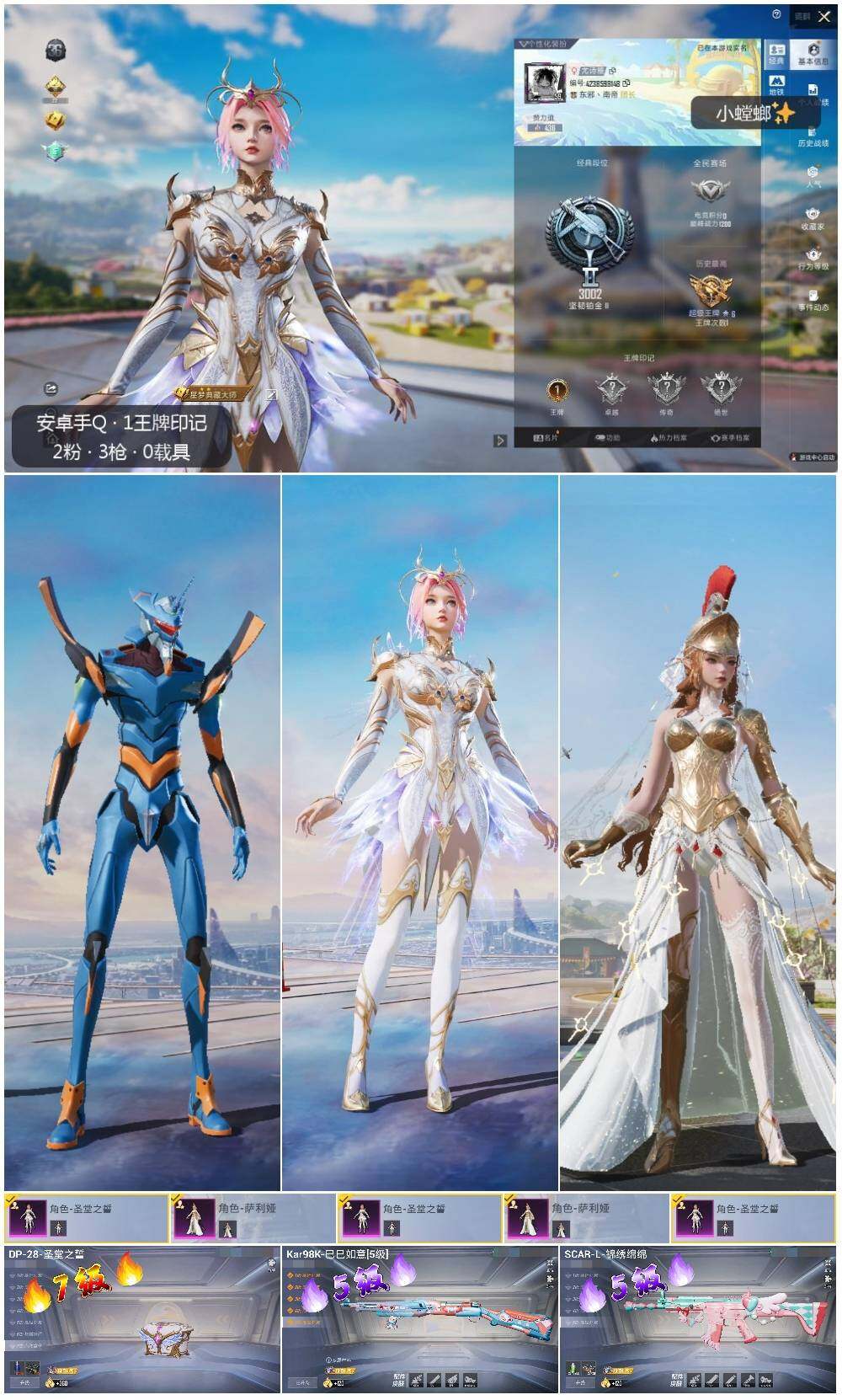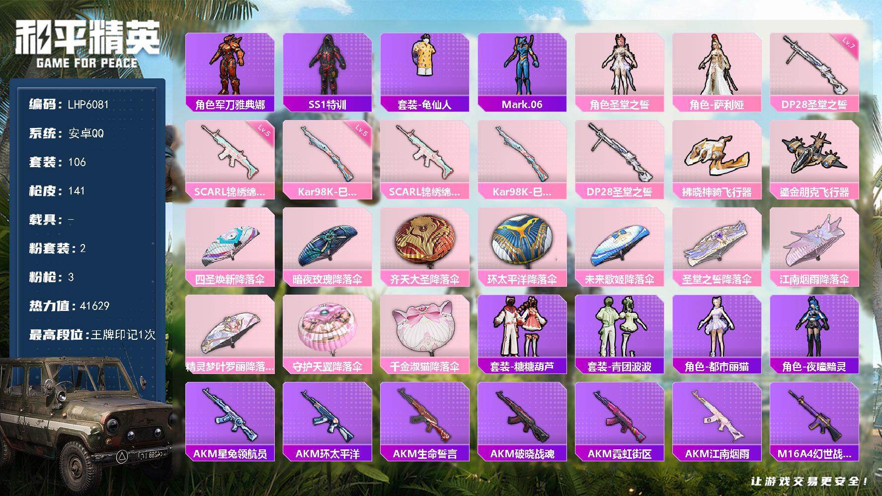 [13659776]可二次【店主推荐捡漏号!可直接换绑】 安卓 手Q-2粉装-3特效枪-2粉色飞行器-4.1w热力值-1王牌印记-106套装-141枪皮【热门品类】:角色-军刀雅典娜,套装-SS1特训,套装-龟仙人,角色-Mark.06【粉色套装】:角色-圣堂之誓,角色-萨利娅【粉色枪皮等级】:SCAR-L-锦绣绵绵(五级),Kar98K-巳巳如意(五级),DP-28-圣堂之誓(七级)【粉色飞行器】:拂晓神骑飞行器,鎏金朋克飞行器