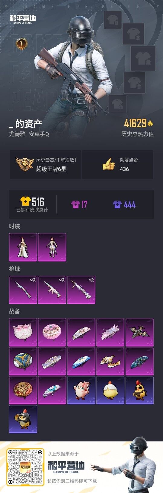 - [13120976]安卓 手Q-3粉装-5特效枪-3载具-2粉色飞行器-39426热力值-3王牌印记-83套装-115枪皮 【热门品类】:套装-龟仙人 【粉色载具】:迈凯伦570S(天际蓝),双人摩托-梦幻火箭,星梦玉骢 【粉色套装】:粉装-恐龙拽拽,粉装-寒光使者,粉装-未来歌姬 【粉色枪皮等级】:M416-风花雪月(七级),汤姆逊-热量炸弹(四级),DP-28-豹影疾电(五级),MG3-酷泡奶龙(五级),MG-36-沧焰双生(五级) 【粉色枪皮】:M416-风花雪月,汤姆逊-热量炸弹,DP-28-豹影疾电,MG3-酷泡奶龙,MG-36-沧焰双生 【粉色飞行器】:梦幻火箭飞行器 【粉色降落伞】:梦幻火箭降落伞,百合蜜语降落伞,暗夜鎏金降落伞,第五大道降落伞,仲夏莫吉托降落伞,飒粉甜心降落伞,星梦奇缘降落伞,荧海星豚降落伞,无垠阁降落伞 【稀有套装】:套装-龟仙人,套装-雏菊兔兔,套装-萝兰蝴蝶,角色-狂花道·娜可露露,角色-都市丽猫,套装-彩虹兔,套装-云朵鹅,套装-雪绒豹,套装-朱霞炽焰,套装-凌霄紫焰,套装-擎苍青焰,角色-敖闰,角色-申公豹 【稀有枪皮】:AKM-破晓战魂,AKM-龙的传人,M16A4-蓝色火焰,SCAR-L-夜灯,SCAR-L-炫彩节奏,SCAR-L-银碳小老虎,M416-糯团青竹,M416-蓝色火焰,GROZA-懵萌河马,GROZA-荧海星豚,AUG-天降萌叽,AUG-纯梦嫁纱,M762-天降萌叽,M762-暗夜鎏金,M762-第五大道,M762-云朵鹅,Mk47-妙红点点,G36C-懵萌河马,AC-VAL-天降萌叽,AC-VAL-快闪甜心,蜜獾-天降萌叽,ARX-凌霄紫焰,UZI-啾咪啾咪,UZI-天降萌叽,UZI-金玉无双,UMP45-仲夏莫吉托,UMP45-涂山之恋,UMP45-生命誓言,Vector-焰鹰斗篷,汤姆逊-天降萌叽,JS9-凌霄紫焰,P90-快闪甜心,Kar98K-梦幻火箭,AWM-焰鹰斗篷,AWM-圣堂之誓,VSS-彩虹符号,Mini14-梦幻火箭,莫辛纳甘-懵萌河马,AMR-妙红点点,M417-惊鸿侠骨,M417-星兔领航员,MK20-H-快闪甜心,M200-仲夏莫吉托,M200-惊鸿侠骨,SVD-云朵鹅,S686-红色方程式,S1897-暗夜鎏金,S12K-玩趣呆呆,DBS-焰鹰斗篷,DBS-圣堂之誓,DBS-第五大道,SPAS-
