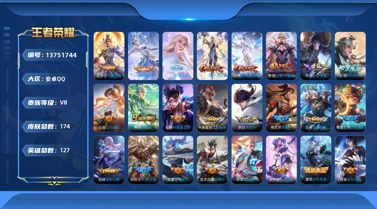 [13751744]【店主推荐捡漏号!可直接换绑】安卓Q-V8-最强王者段位-125英雄-174皮肤-2典藏-1无双-22传说-56史诗